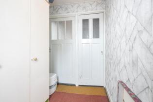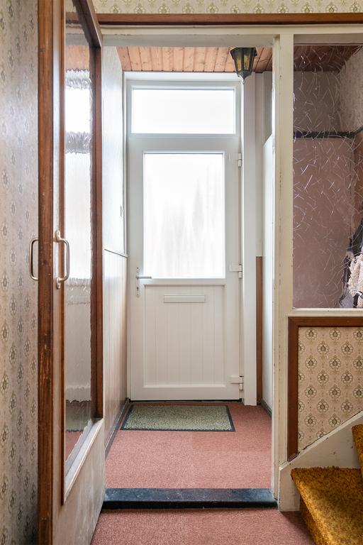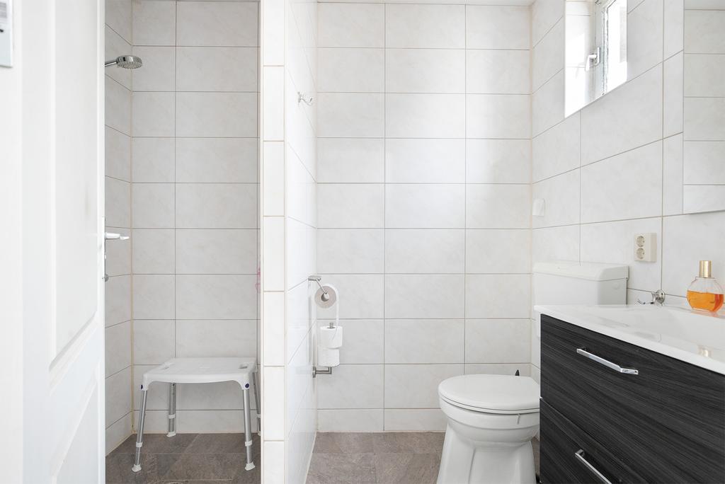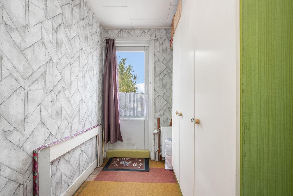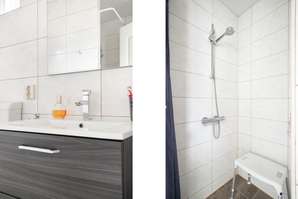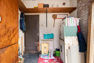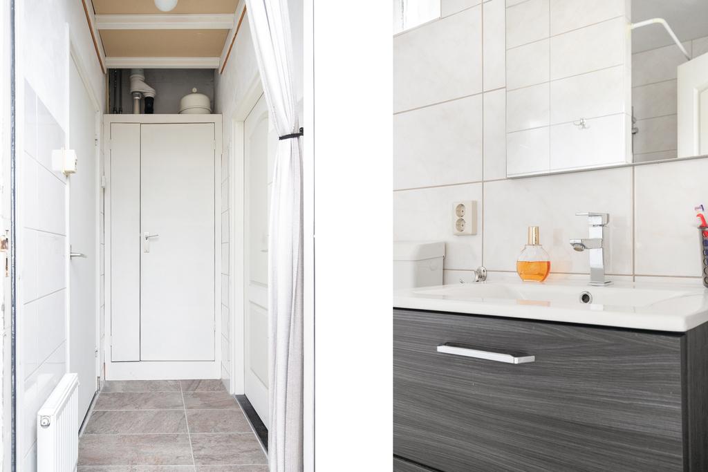 Het portaal is voorzien van een tegelvloer en biedt plek aan de Cv-installatie (Intergas 2012). Vanuit het portaal zijn de badkamer en de achtertuin bereikbaar. De badkamer is modern afgewerkt en volledig betegeld. Zo is er een inloopdouche, staand toilet en wastafelmeubel.