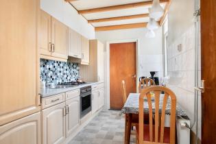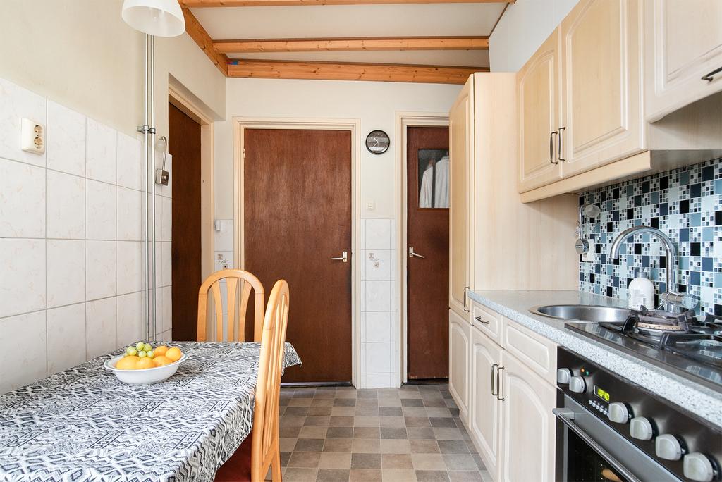 Vanuit de woonkamer is de keuken bereikbaar. De keuken is voorzien van een rechte opstelling, deels betegelde wanden en een vinyl vloer. De inrichting bestaat uit een 4-pits gaskookplaat, afzuigkap, oven, koel-vriescombinatie en een separate aansluiting voor de vaatwasser. Vanaf de keuken is een extra diepe kast bereikbaar als ook de berging en het portaal richting de badkamer.