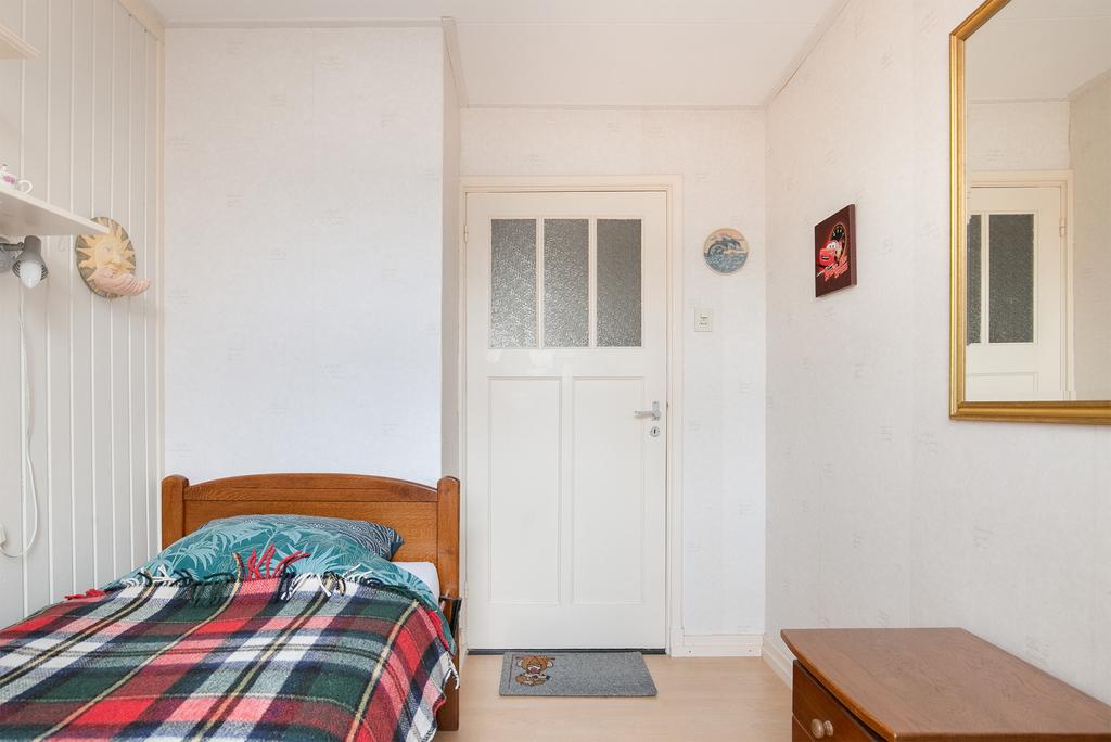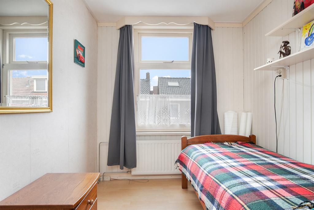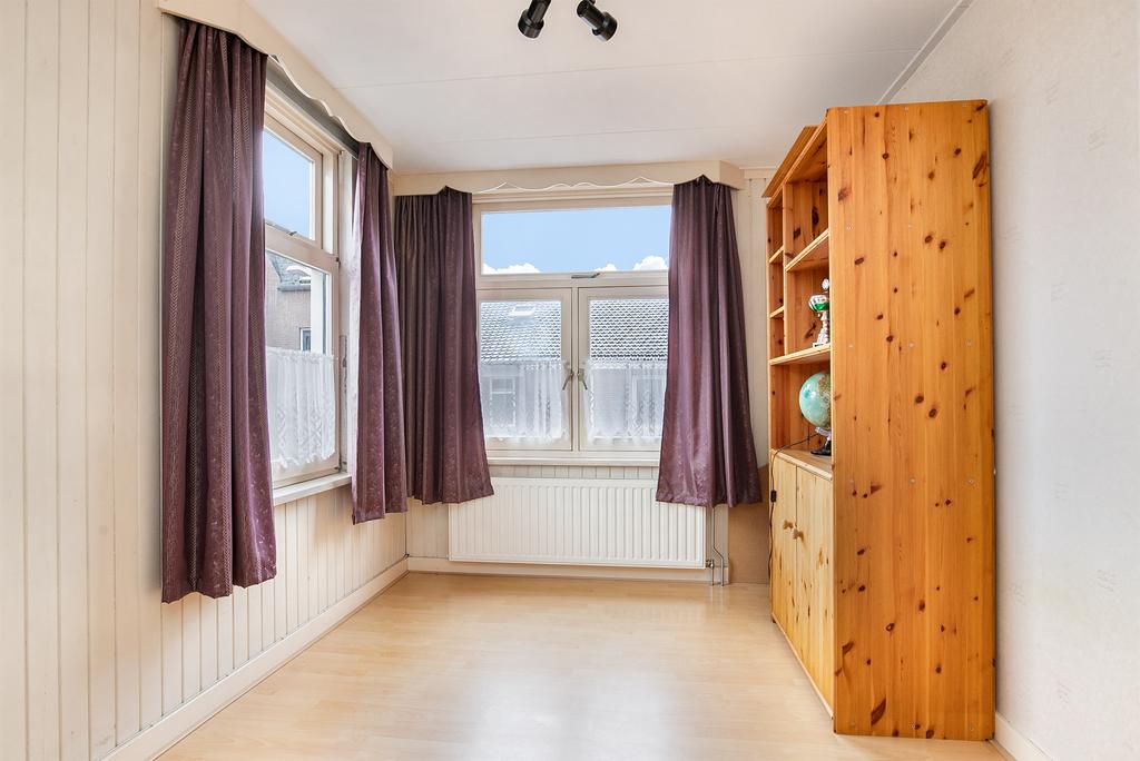 Vanaf de overloop zijn alle 4 de aanwezige slaapkamers bereikbaar. De 1e en 2e slaapkamer liggen aan de voorzijde van de woning en zijn respectievelijk ca. 6,4 m2 en 10,2 m2 groot. Beide kamers zijn voorzien van een laminaatvloer en behang op de wanden. Daarnaast beschikken deze kamers over houten kozijnen met dubbele beglazing. De 3e en 4e slaapkamer liggen aan de achterzijde van de woning en zijn respectievelijk ca.11,7m2 en 4,7 m2 groot. Beide kamers zijn voorzien van vloerbedekking en behang op de wanden. Deze kamers beschikken daarnaast over houten kozijnen met enkel glas. Zowel slaapkamer 2,3 en 4 beschikken over vaste kasten. Vanuit de 4e slaapkamer is daarnaast ook nog het platte dak te bereiken.