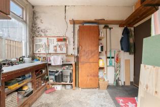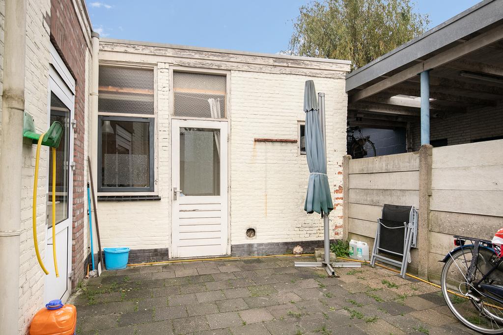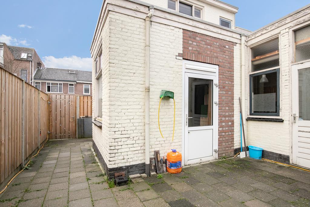 De tuin is volledig voorzien van bestrating en heeft dankzij de ligging voldoende zonlicht. De tuin is voorzien van een nette schutting en naast de woning ligt de achterom. De berging is zowel vanuit de keuken als vanuit de tuin te bereiken en voorzien van de aansluitingen voor de wasapparatuur.