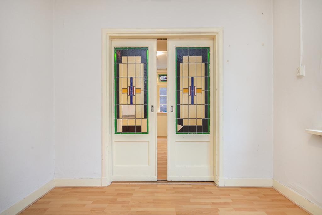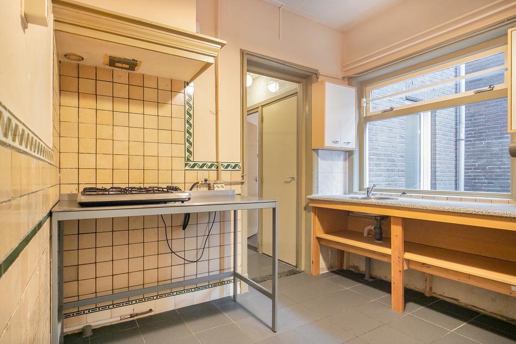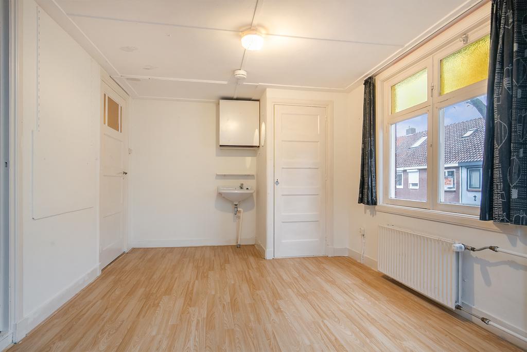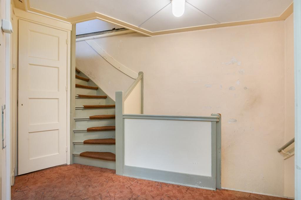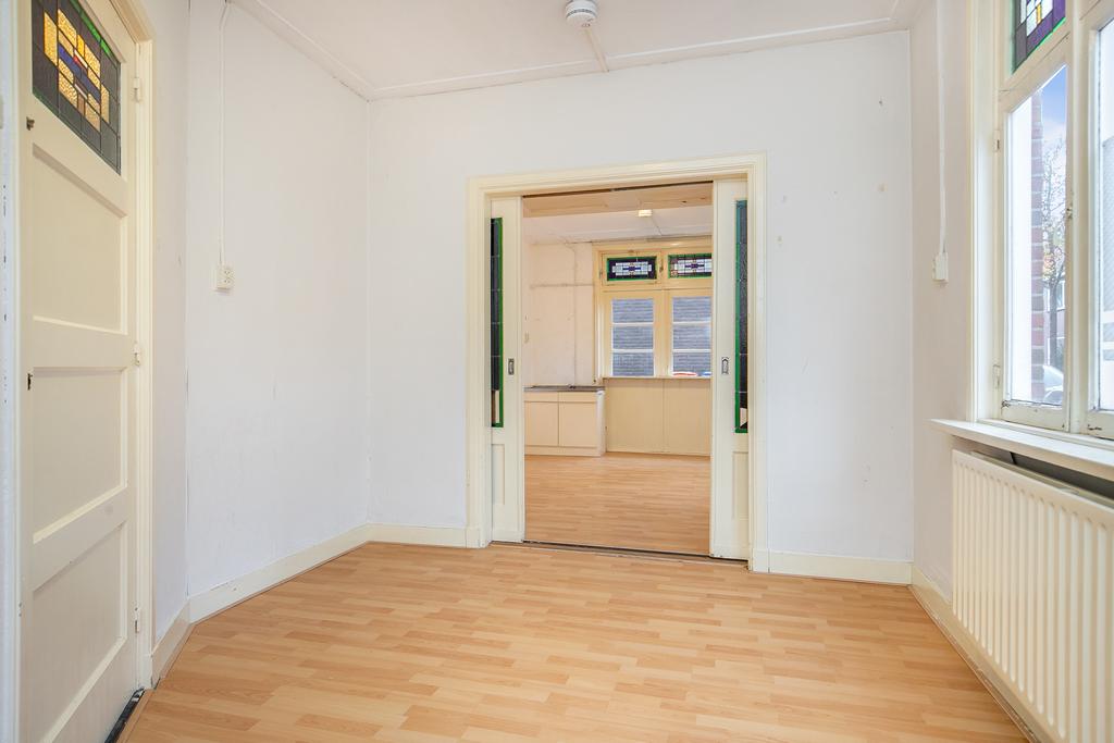We treden de woning binnen in de hal met kelderkast en brandmeldingstallatie. De authentieke tegels zijn hier nog aanwezig en vanuit de hal kun je naar de woonkamer met ensuite deuren en speelse indeling, eventueel in een woonkamer en eetkamer. De woonkamer heeft aan de achterzijde tuindeuren en er zijn inbouwkasten. De afgelopen periode is dit als een kamer verhuurd. Aan de achterzijde is de keuken gelegen, deze heeft een eenvoudige inrichting en ook toegang tot de achtertuin. Dan bereiken we de gang met aan weerszijde kasten, in een daarvan is de cv-ketel gesitueerd en in de andere de aansluitingen voor de wasapparatuur. In de aanbouw is de badkamer gemaakt en deze is praktisch ingericht en voorzien van tegelwerk, een douche, toilet en wastafel.