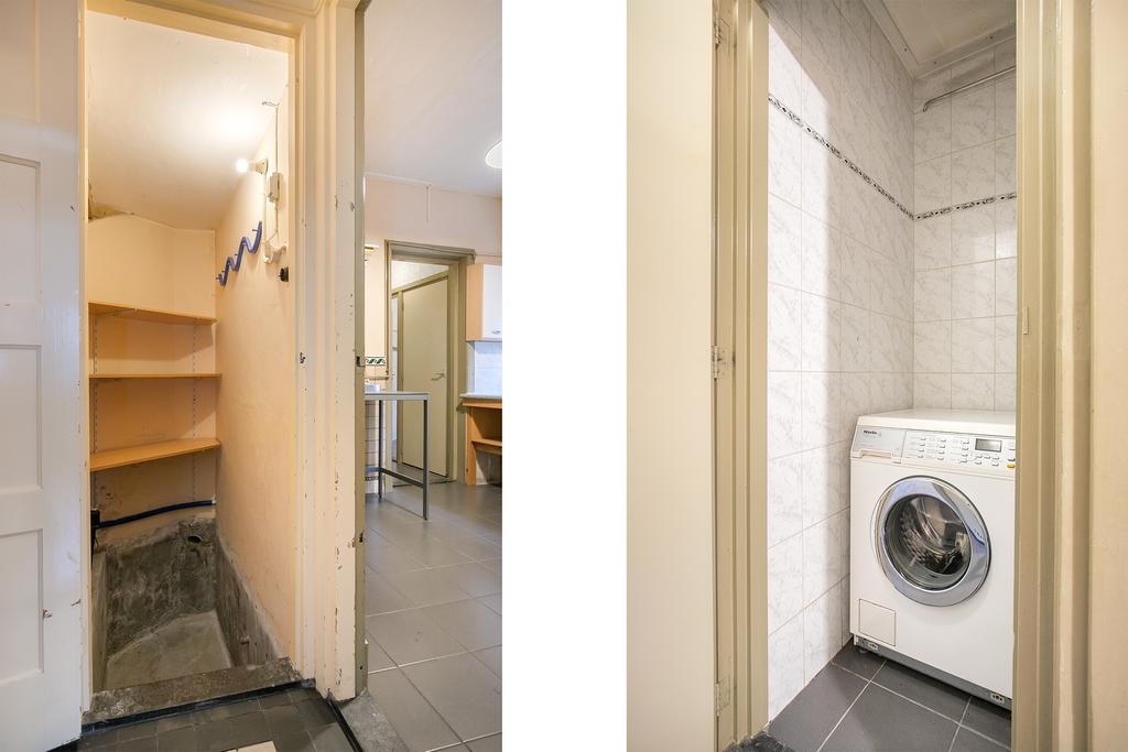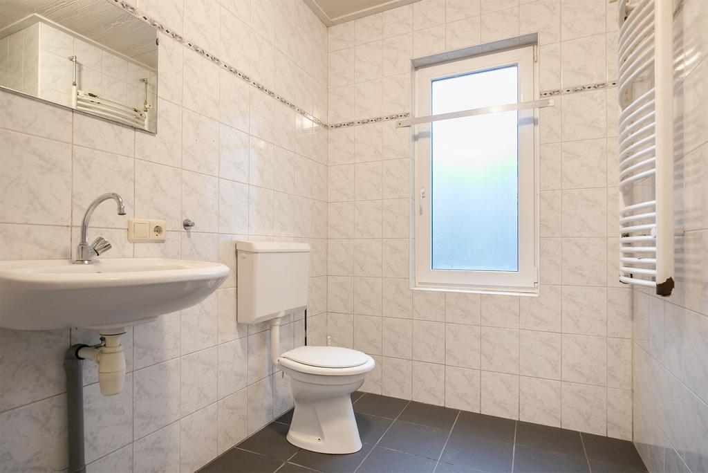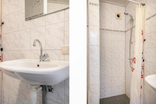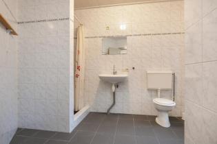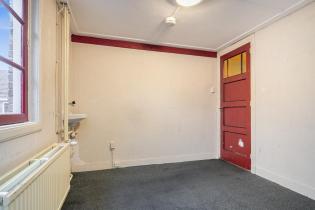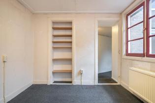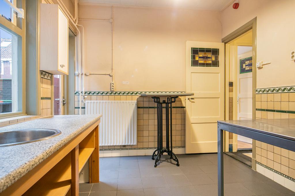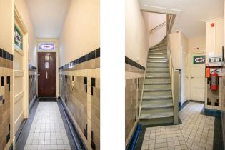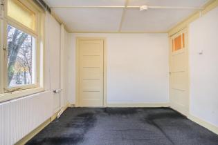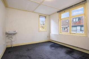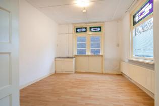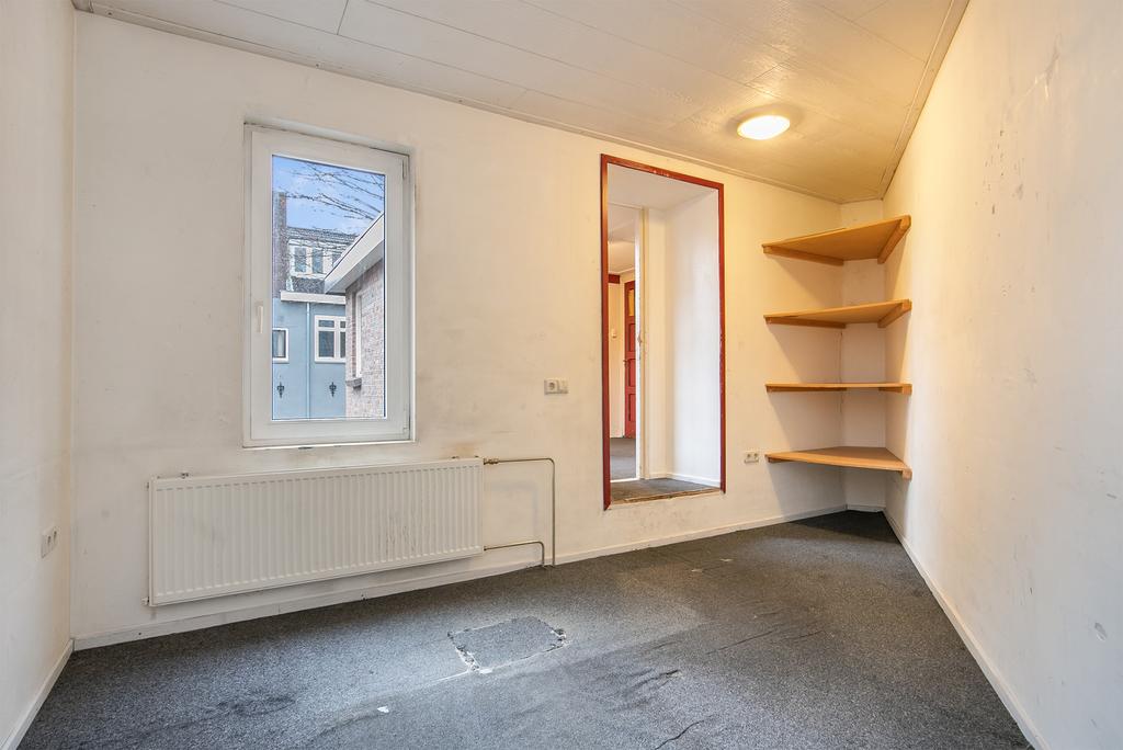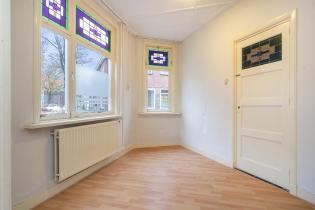 We treden de woning binnen in de hal met kelderkast en brandmeldingstallatie. De authentieke tegels zijn hier nog aanwezig en vanuit de hal kun je naar de woonkamer met ensuite deuren en speelse indeling, eventueel in een woonkamer en eetkamer. De woonkamer heeft aan de achterzijde tuindeuren en er zijn inbouwkasten. De afgelopen periode is dit als een kamer verhuurd. Aan de achterzijde is de keuken gelegen, deze heeft een eenvoudige inrichting en ook toegang tot de achtertuin. Dan bereiken we de gang met aan weerszijde kasten, in een daarvan is de cv-ketel gesitueerd en in de andere de aansluitingen voor de wasapparatuur. In de aanbouw is de badkamer gemaakt en deze is praktisch ingericht en voorzien van tegelwerk, een douche, toilet en wastafel.