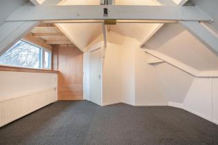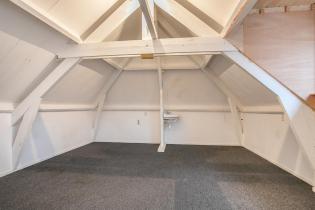 Middels een vaste trap bereiken we de zolder. Ook hier is weer een mooie grote slaapkamer gerealiseerd. De vernieuwde dakkapel geeft extra ruimte en is voorzien van kunststof kozijnen en dubbele beglazing. De naastgelegen bergruimte is echt ideaal. De zolder is geïsoleerd en het gehele dak is vervangen met prachtige nieuwe dakpannen.
