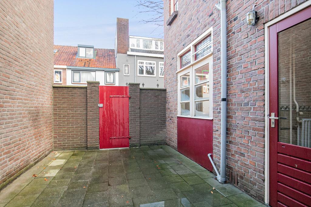 De tuin is bestraat en een fijne plek om in alle rust in het zonnetje te zitten of even de schaduw op te zoeken. Vanuit de tuin is er toegang tot de straat.