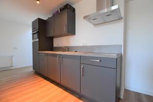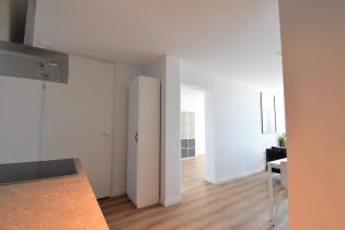 We treden het appartement binnen in de entree vlakbij de moderne keuken. De keukeninrichting is strak en eigentijds met moderne apparatuur zoals een koelkast, combi-oven, inductiekookplaat, recirculatiekap en vaatwasser.