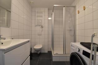 Aan de andere kant van de keuken is de badkamer gesitueerd welke voorzien is van een toilet, douche, een wastafelmeubel met opbergruimte en de aansluiting voor de wasmachine.