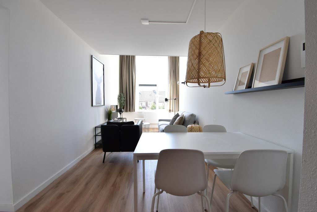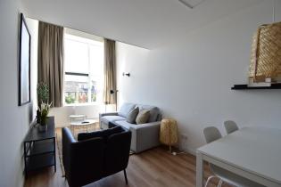 Als we verder doorlopen zien we de knusse woonkamer welke genoeg ruimte geeft voor een een gezellige zithoek en een eettafel met vier stoelen. Door de hoge ramen komt er veel licht binnen in het appartement.