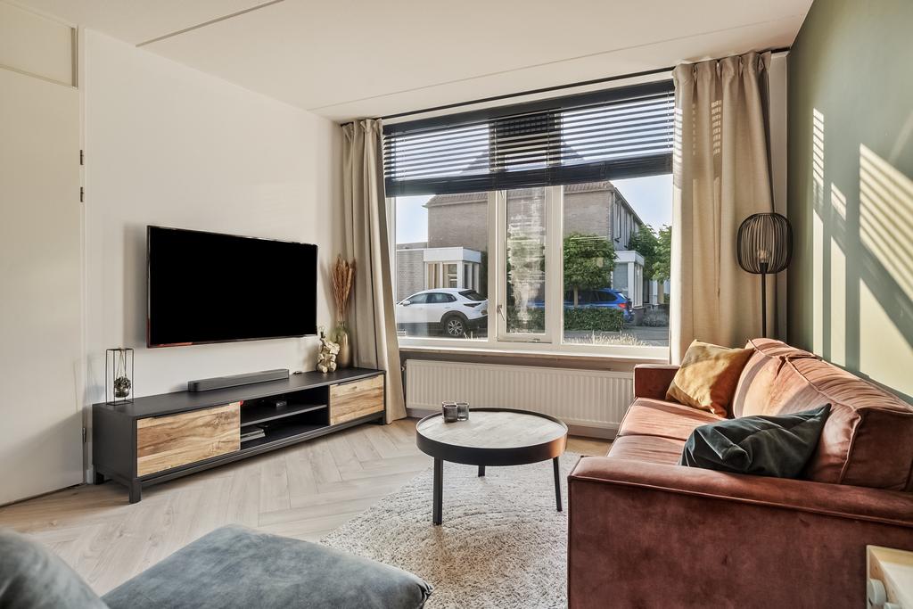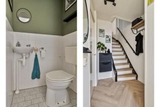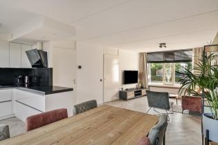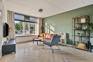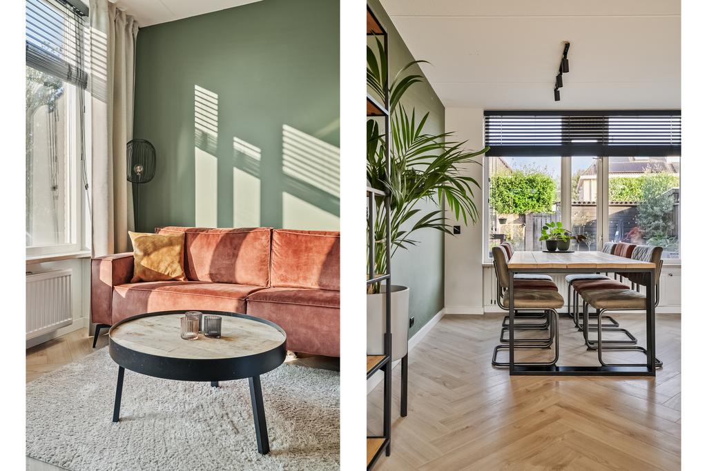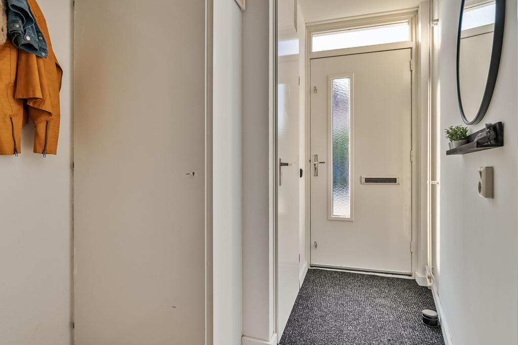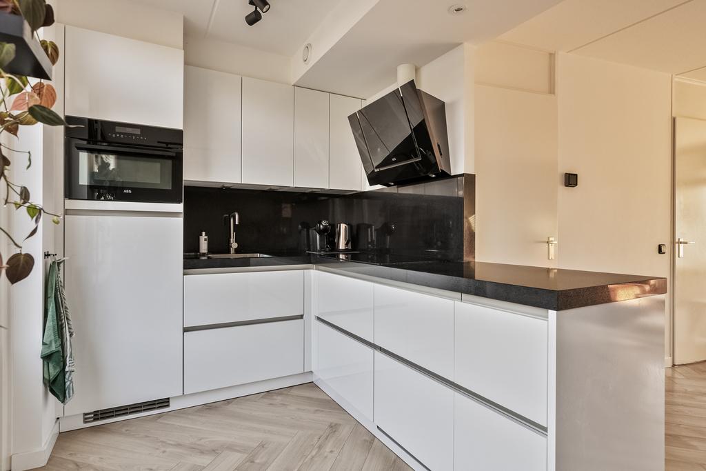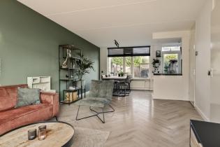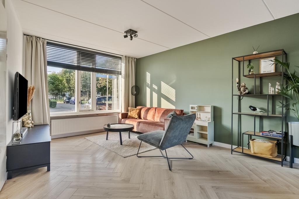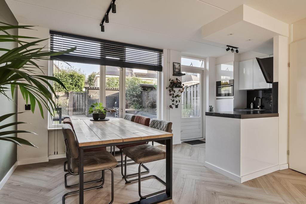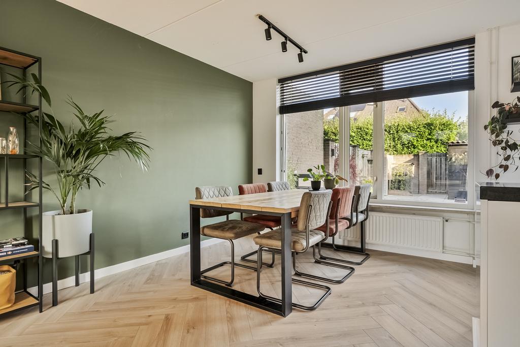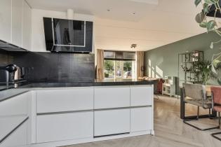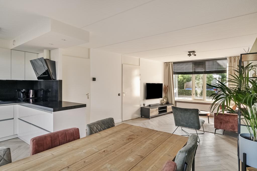 We komen de woning binnen in de hal/entree, hier zijn de meterkast, trapopgang en de toiletruimte gesitueerd. De toiletruimte is deels betegeld en voorzien van een staand toilet. In de hal ligt een visgraat laminaatvloer welke over de gehele verdieping is doorgetrokken. De wanden zijn glad gestuukt en het plafond is voorzien van spuitwerk. Vanuit de hal komen we de heerlijk lichte woonkamer binnen. De zithoek is aan de voorzijde gelegen en heeft een fijn vrij zicht richting het grote groene plein aan de overkant. Naast de deur die naar de hal leidt is er nog een trapkast aanwezig, een fijne en praktische provisieruimte. De keuken is in 2017 volledig vernieuwd en luxe afgewerkt. Zo is er een inductiekookplaat, afzuigkap, vaatwasmachine, combi-oven en koelkast. Naast de keuken is voldoende ruimte voor een 6-persoons eettafel en ook hier zijn grote raampartijen aanwezig voor veel lichtinval.