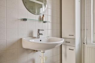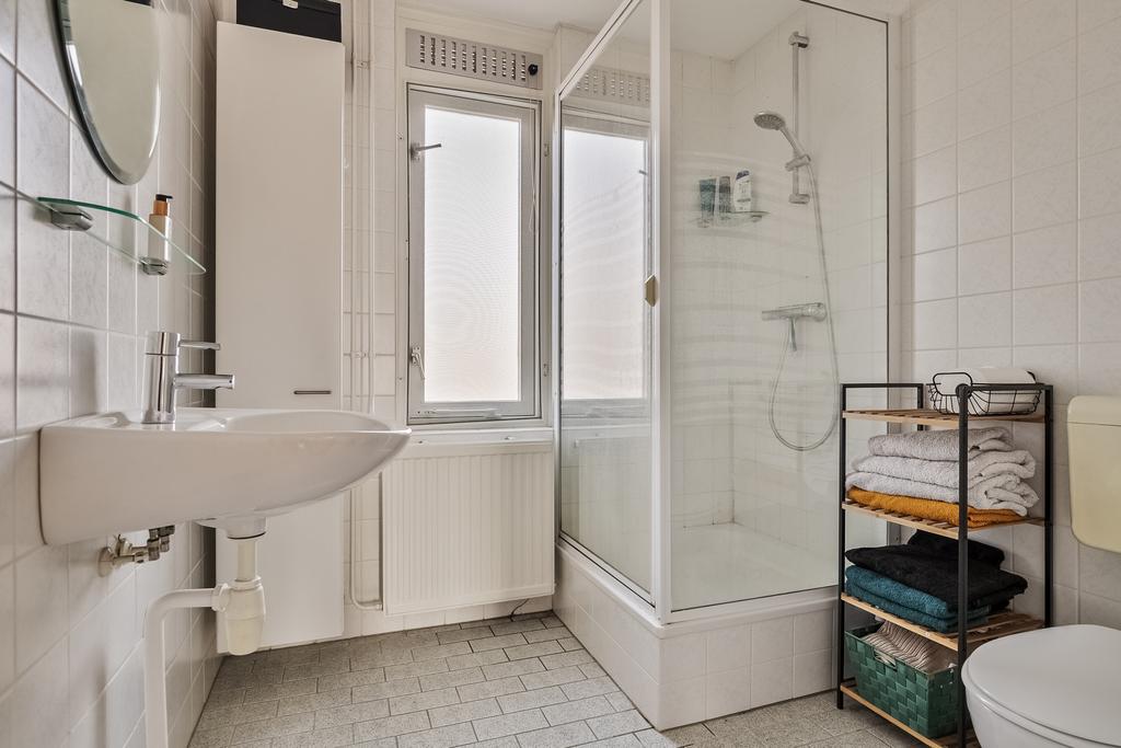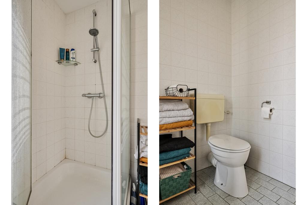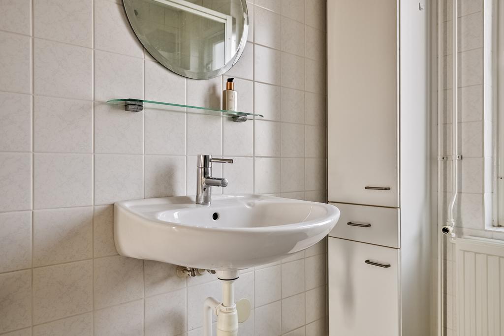De badkamer is net als de toiletruimte nog origineel maar altijd netjes onderhouden. De badkamer is volledig betegeld en voorzien van een douchecabine, wastafel en staand toilet.
