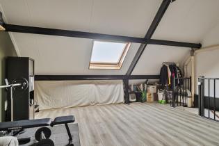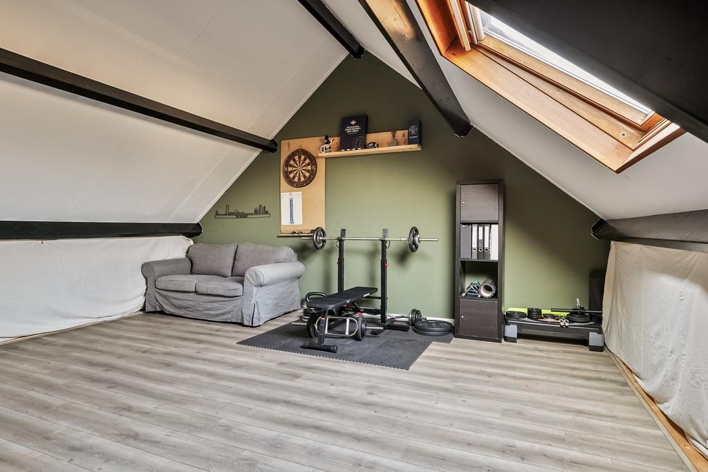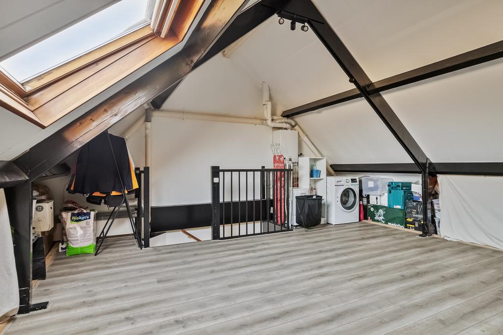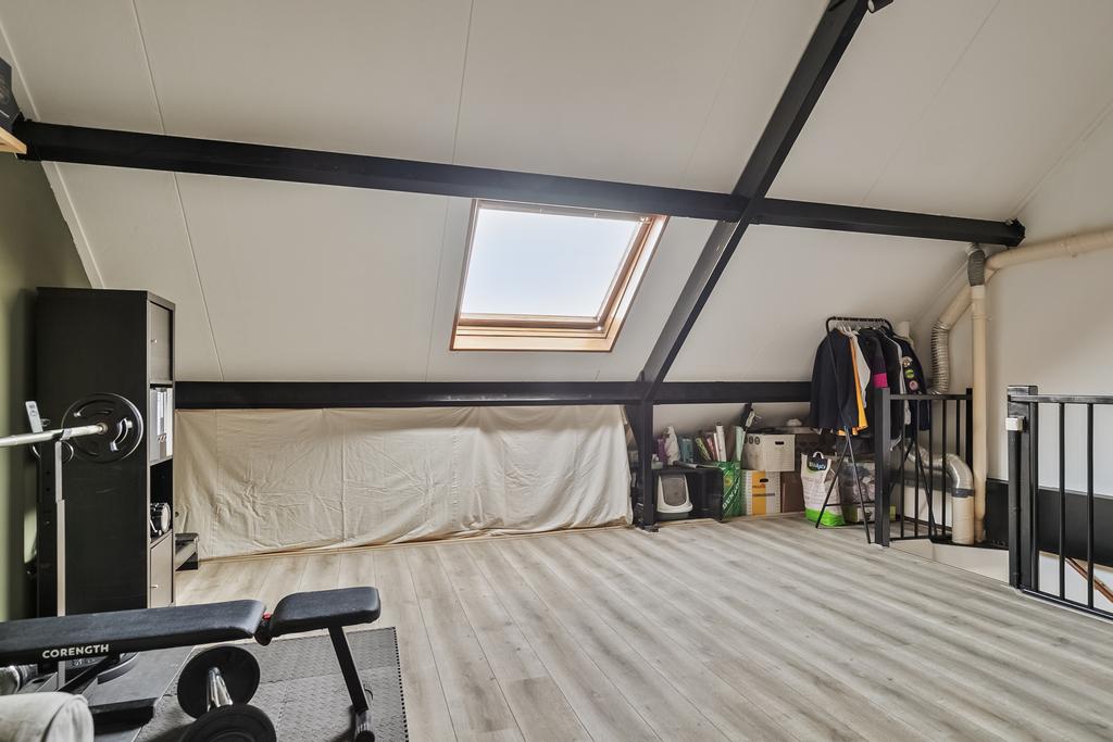 Verder geeft de zolder voldoende bergruimte onder de schuine kanten en zorgt het grote dakraam voor voldoende lichtinval.