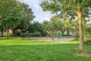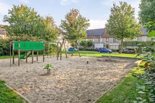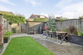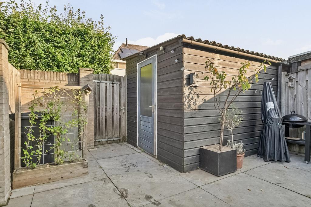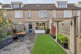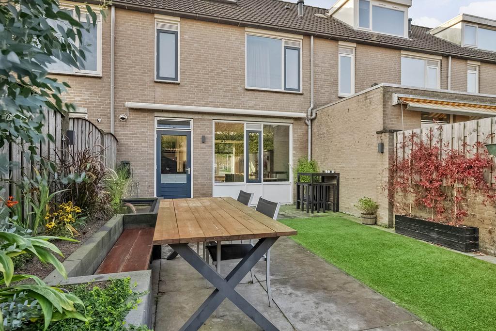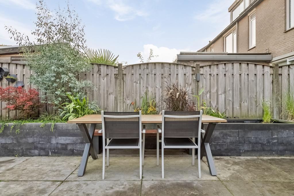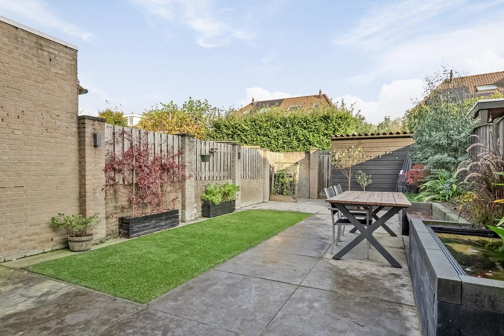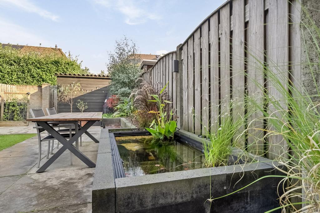 Vanuit de keuken is de achtertuin bereikbaar welke gezellig en modern aanvoelt. Er liggen grote tegels, kunstgras en aan de rechterzijde is een verhoogde border gemaakt met vijver, een bankje en diverse planten. Aan de gevel hangt een groot elektrisch bedienbaar zonnescherm en is er een buitenkraan. Achter in de tuin is de achterom te bereiken als ook de houten berging welke beschikt over elektra. De tuin geeft veel privacy aan de achterzijde door de ligging van de achterburen en de geplante leibomen in die tuinen.