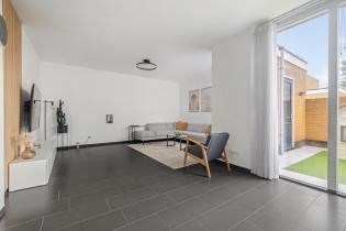 The modern kitchen is located at the front of the house and can be accessed from the living room. The kitchen is designed in a practical L-shape and comes with built-in appliances, including an induction hob, dishwasher, extractor hood, and combination oven. There is also ample cabinet space.
