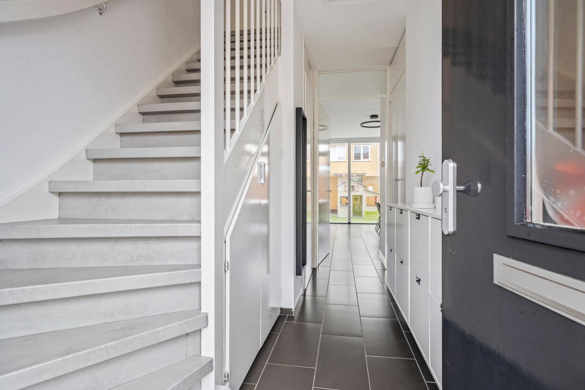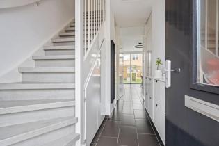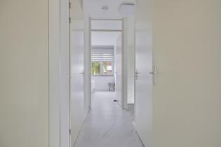 De ruime hal, voorzien van een nette tegelvloer en strak gestucte wanden, geeft toegang tot de trapopgang naar de eerste verdieping, het toilet, de meterkast en de woonkamer. Onder de trap bevindt zich handige bergruimte. Het toilet is modern afgewerkt, volledig betegeld en voorzien van een zwevend closet, een fonteintje en mechanische ventilatie.