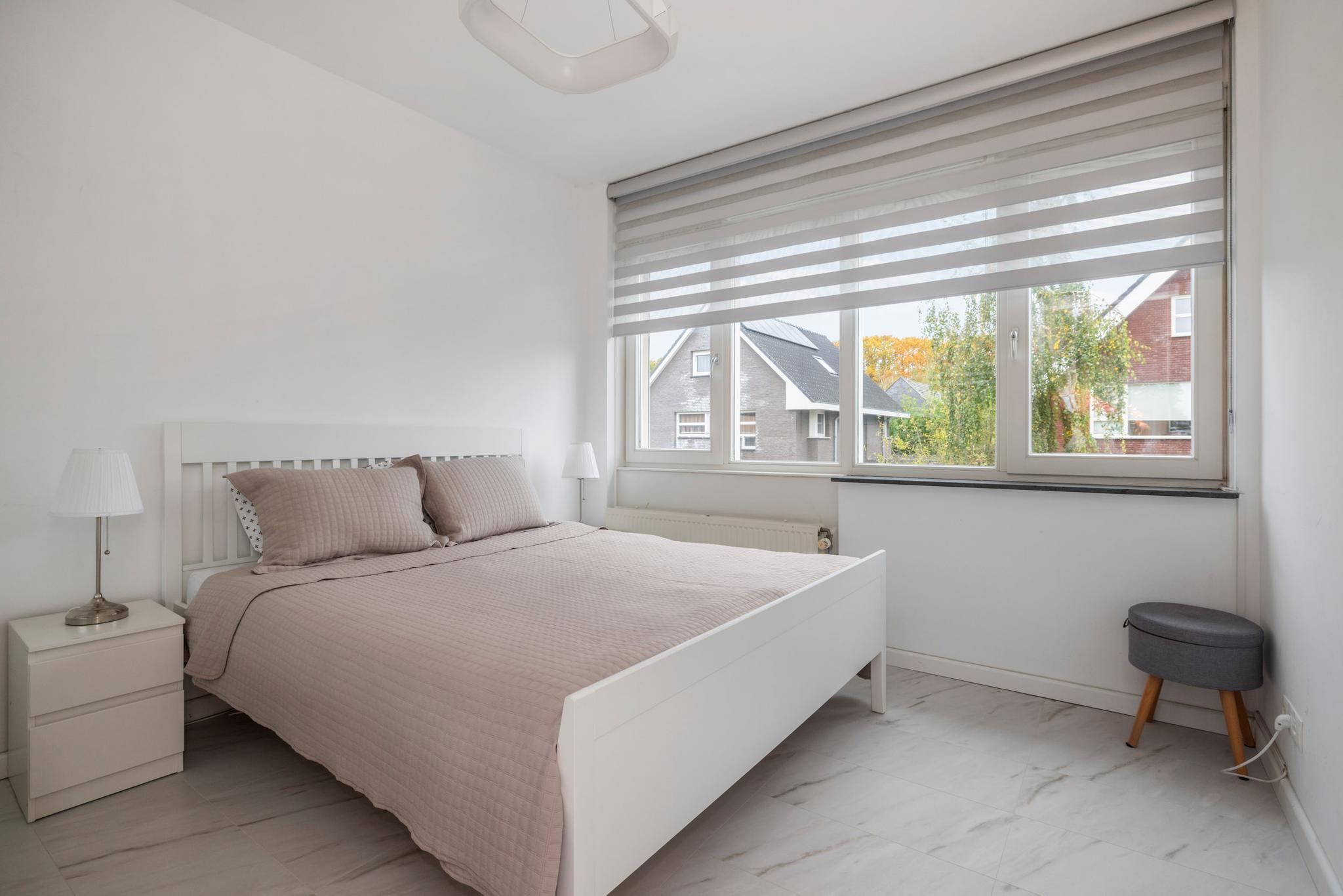 De ruime hoofdslaapkamer, gelegen aan de voorzijde van de woning, beschikt over grote draaikiepramen. Dankzij het vele natuurlijke licht heeft deze kamer een rustige en aangename uitstraling.