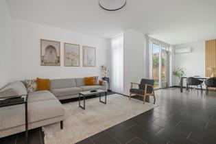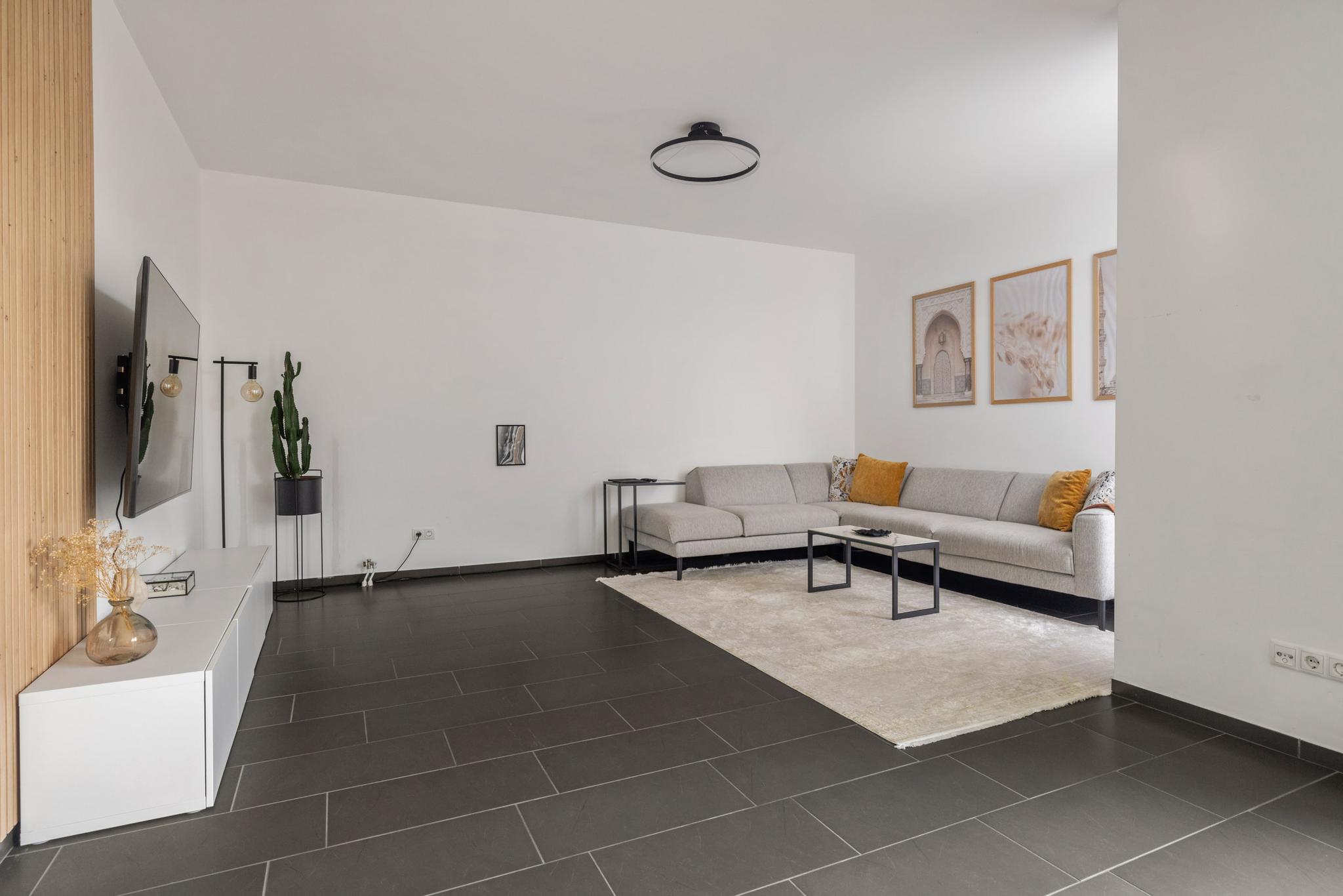 De lichte en ruime woonkamer, die toegankelijk is vanuit de hal, grenst aan het eetgedeelte bij de keuken. Net als de rest van de begane grond is de woonkamer voorzien van een tegelvloer, strak gestucte wanden, houten kozijnen en dubbele beglazing. Dankzij de grote raampartijen en de tuindeur naar de achtertuin geniet u van veel natuurlijk lichtinval. Voor extra comfort is de woonkamer uitgerust met airconditioning, ideaal tijdens warme zomerdagen.