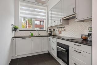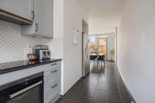 De moderne keuken bevindt zich aan de voorzijde van de woning en is toegankelijk vanuit de woonkamer. De keuken is uitgevoerd in een praktische L-opstelling en beschikt over inbouwapparatuur, waaronder een inductiekookplaat, vaatwasser, afzuigkap en combi-oven. Daarnaast biedt de keuken volop kastruimte.