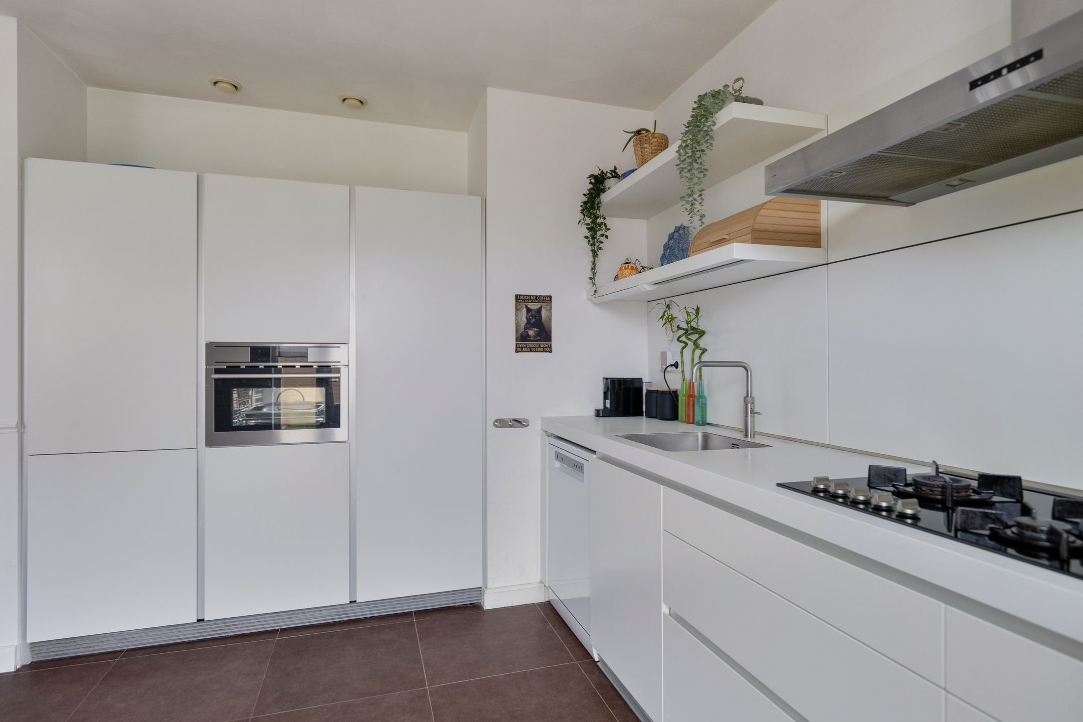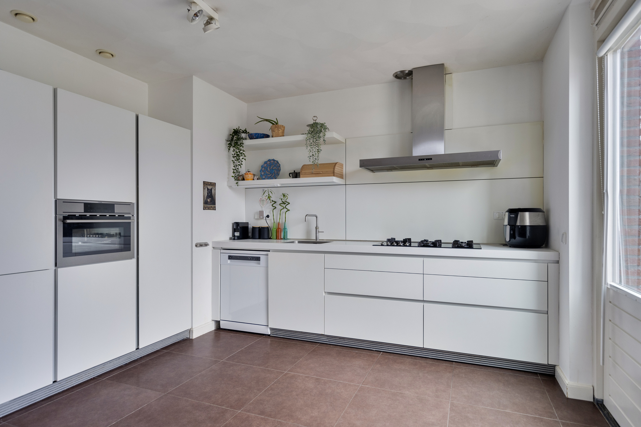 De stijlvolle witte Bulthaup open keuken is voorzien van een handige provisiekast, een loopdeur naar de tuin en hoogwaardige inbouwapparatuur, waaronder een 5-pits gaskookplaat met wokbrander, afzuigkap, quooker, vaatwasser