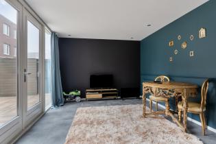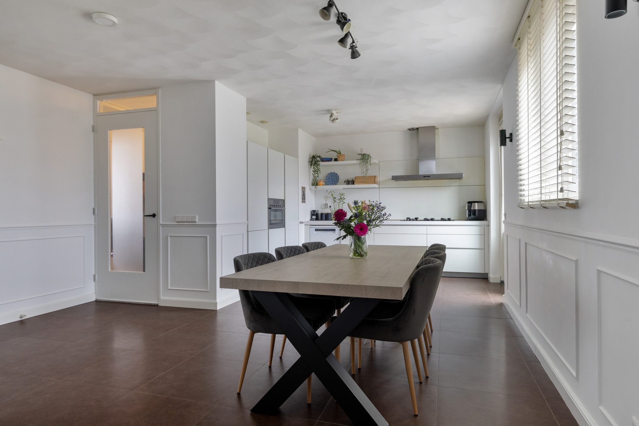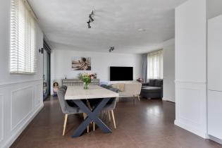 De ruime en lichte woonkamer biedt toegang tot de werk-/speelkamer met openslaande deuren naar het terras en de achtertuin. De woonkamer is voorzien van een tegelvloer, gestucte wanden met lambrisering en een schuurwerk plafond.