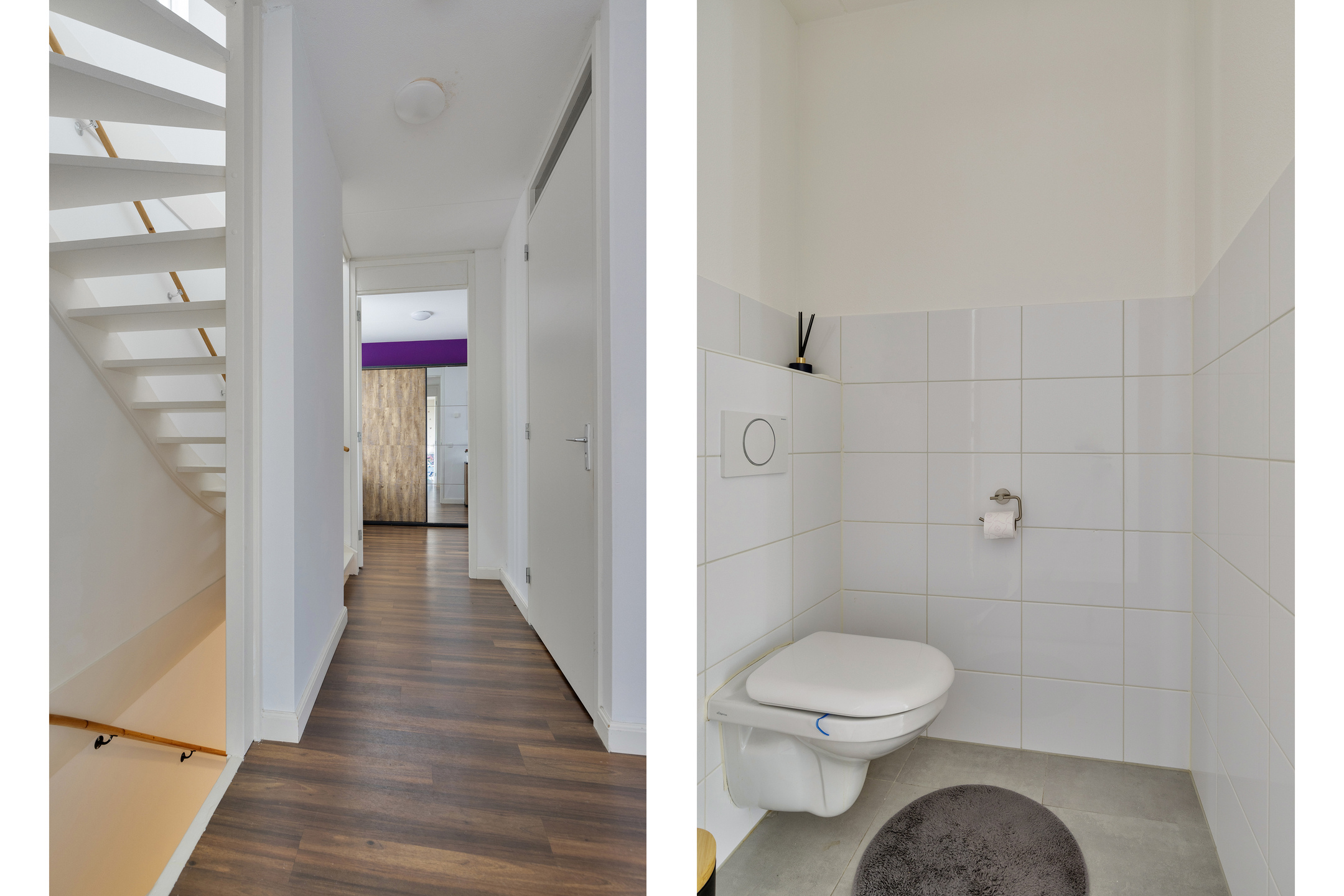 Via de overdekte entree komt u in de hal met trapopgang, modern toilet en meterkast. De toiletruimte is deels betegeld en voorzien van een vrijhangend closet en fonteintje.