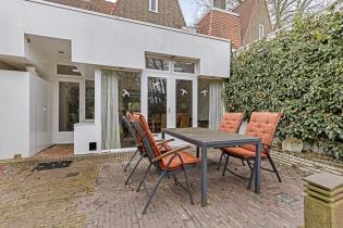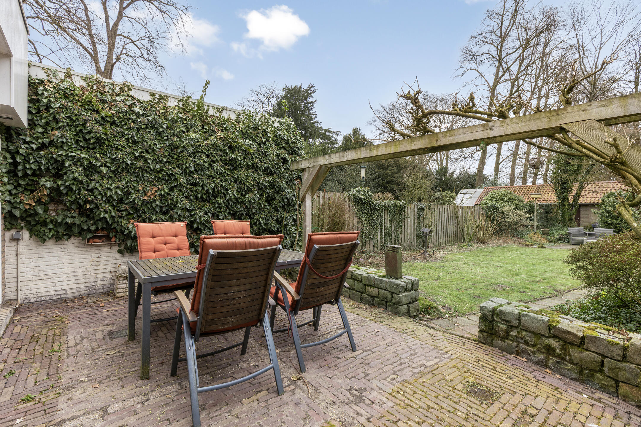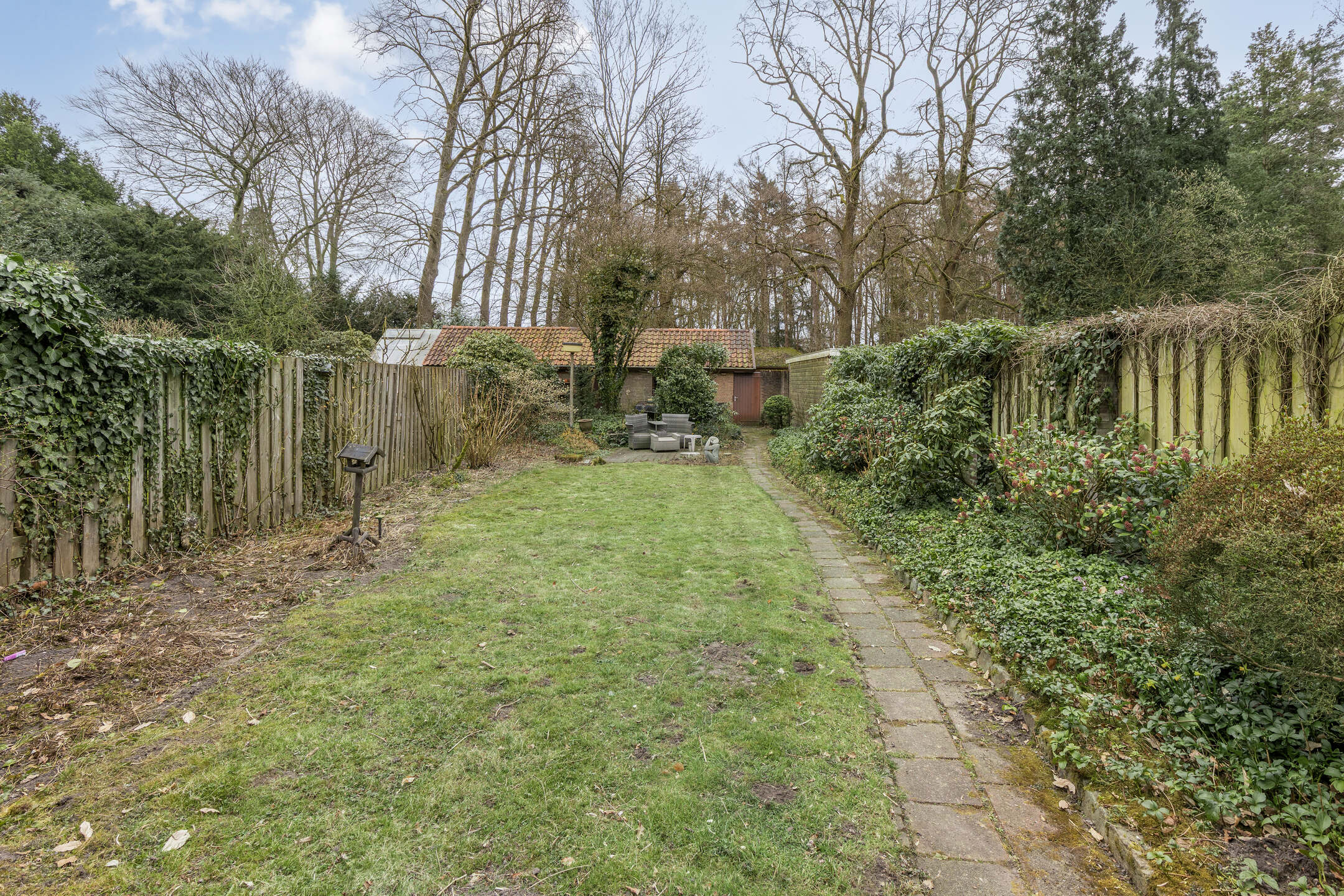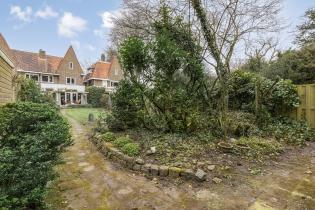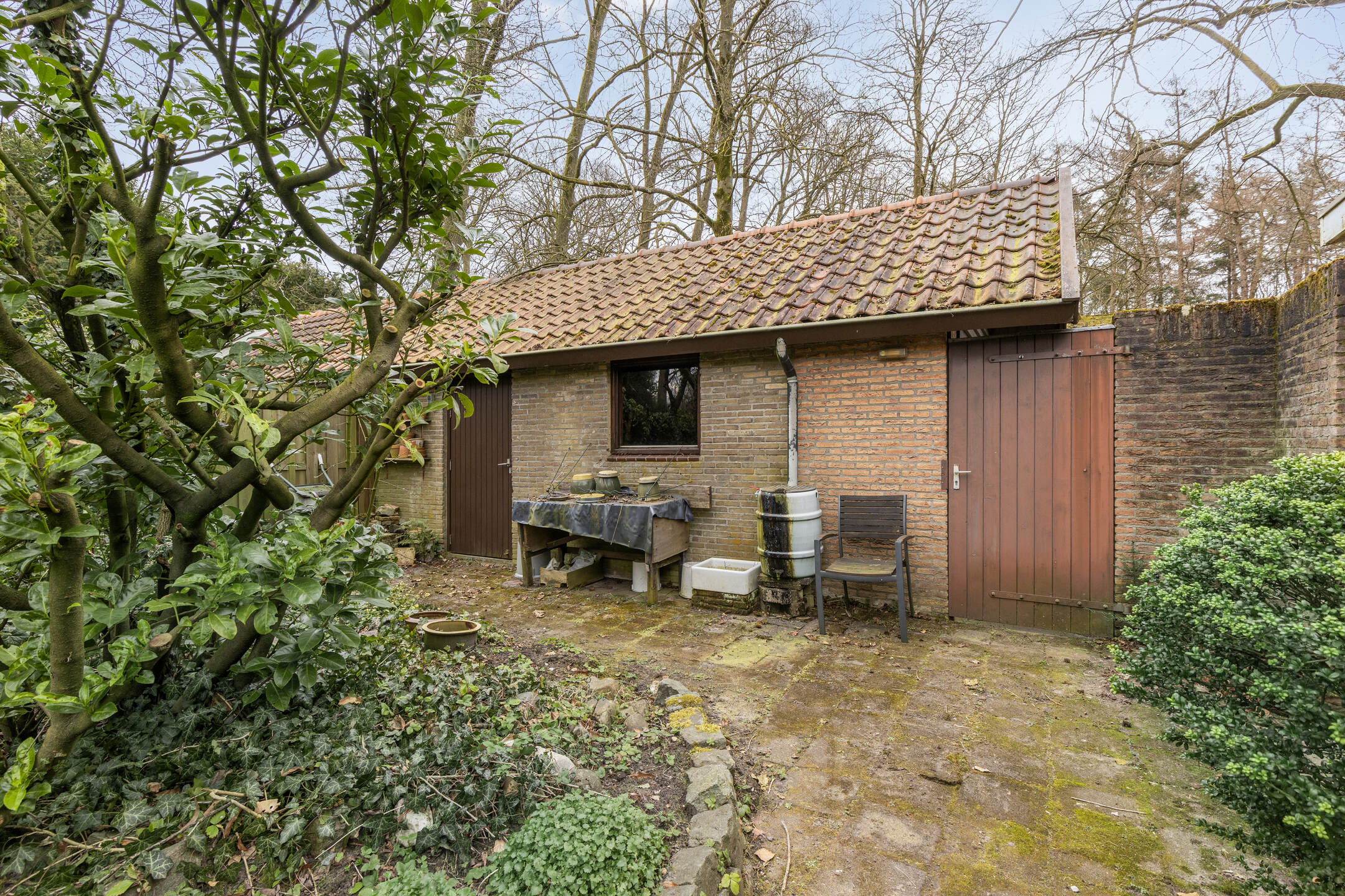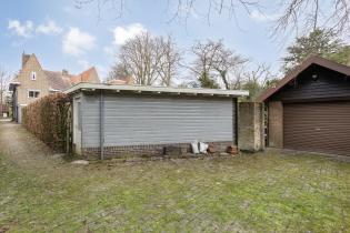 De diepe en brede achtertuin is een ware oase van rust. Dankzij de bosrijke ligging en het ontbreken van directe achterburen geniet je hier van maximale privacy. Een ruim terras bij de woning, met een pergola die zomers schaduw biedt door de blauwe regen die eroverheen is geleid, biedt een fijne plek om te ontspannen, terwijl het gazon, de diverse beplanting en de borders met groen voor een natuurlijke uitstraling zorgen. Achter in de tuin bevindt zich een royale garage met een nok en vliering, perfect voor opslag of het stallen van een auto. De garage zelf is ruim genoeg voor een normale auto, maar de toegangsweg is slechts breed genoeg voor een kleinere auto. De garage is voorzien van water en elektra en bereikbaar via de achterom.