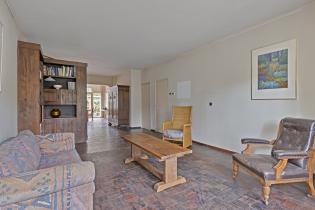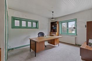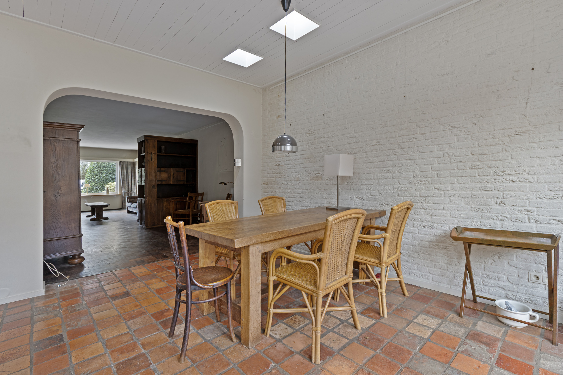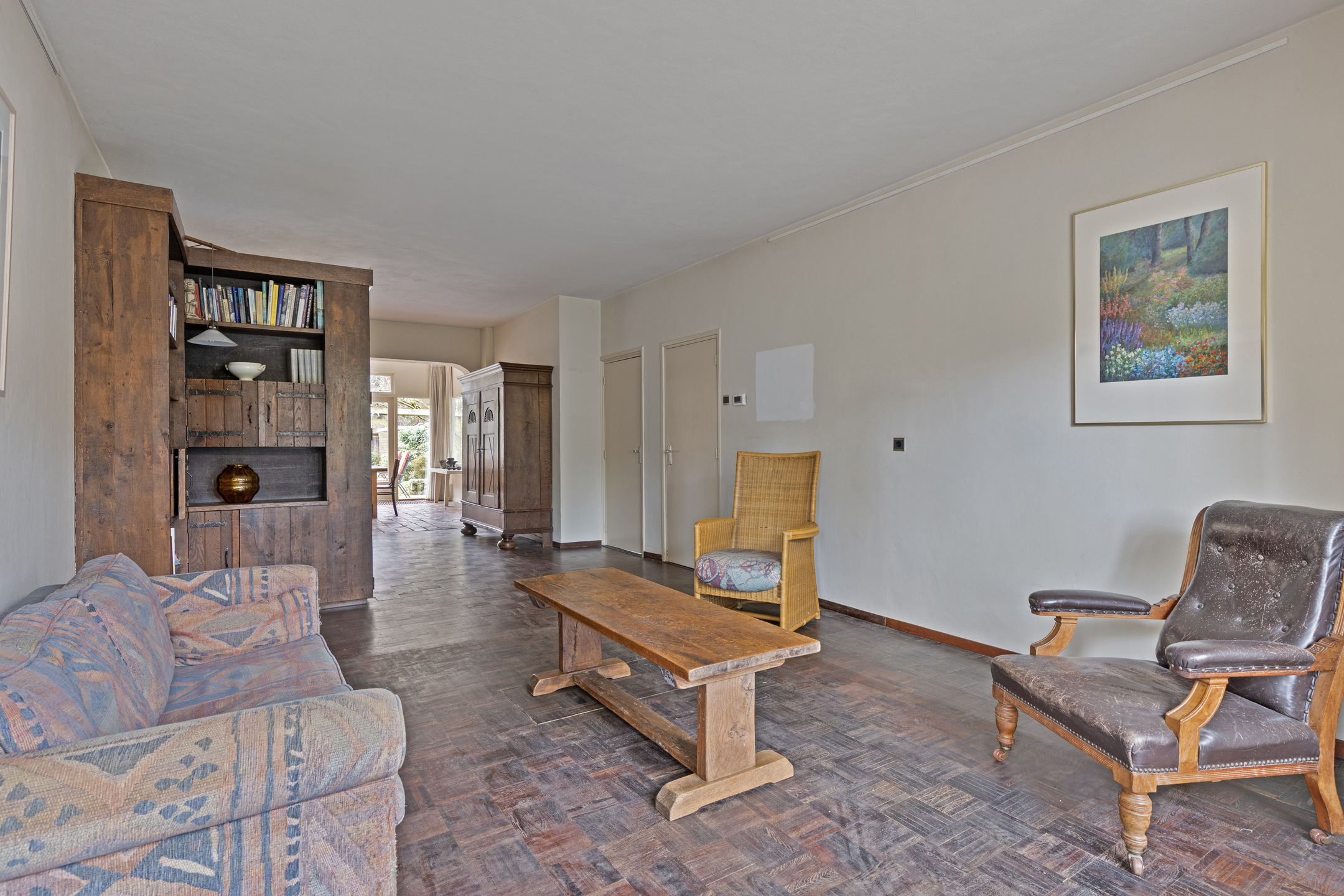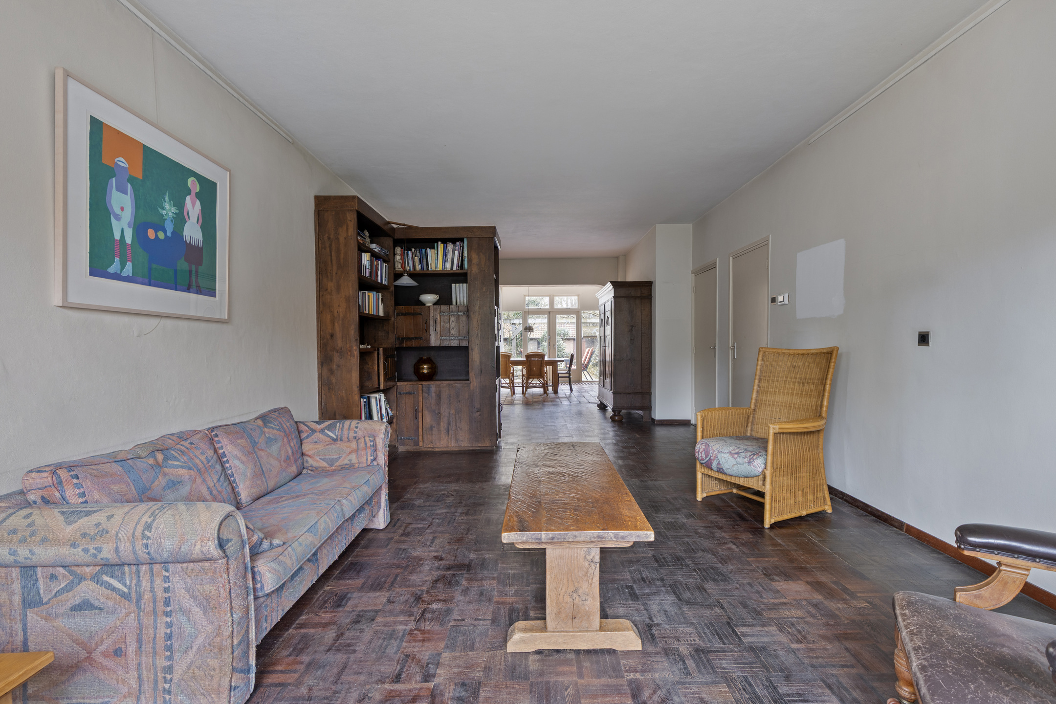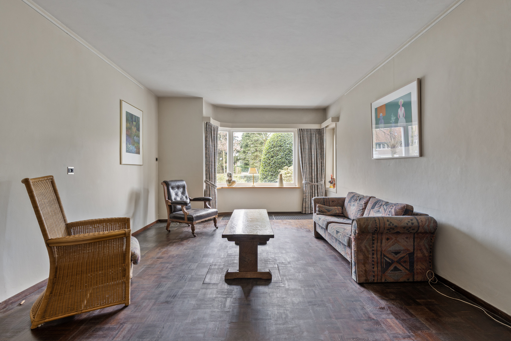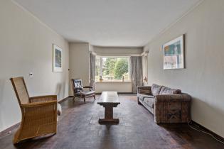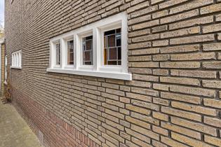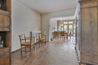 De woonkamer is opvallend diep en biedt volop ruimte voor een royale zit- en eethoek. Dankzij de erker aan de voorzijde en de lange zichtlijn naar de tuin voelt de ruimte extra licht en open. Aan de zijgevel zijn twee reeksen van vier glas-in-loodramen aanwezig, die momenteel zijn dichtgezet, maar eenvoudig weer in het zicht gebracht kunnen worden voor extra lichtinval en een karakteristieke uitstraling. In de woonkamer ligt een parketvloer en de convectorput zorgt voor een aangename verwarming.