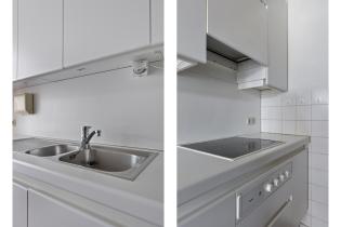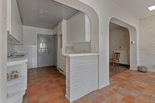Achter de woonkamer bevindt zich de tuinkamer, een veelzijdige ruimte met direct zicht op de diepe achtertuin die eveneens verwarmd wordt via een convectorput. Deze ruimte leent zich perfect voor een grote woonkeuken. Met een directe verbinding naar de tuin en de mogelijkheid om hier een ruim kook- en eetgedeelte te realiseren, wordt dit het hart van de woning. De tuinkamer grenst aan de bestaande keuken, die nu nog een dubbele rechte opstelling heeft met veel kastruimte en is voorzien van een elektrische kookplaat, afzuigkap en koelkast. Door de keuken open te breken en te betrekken bij de tuinkamer, ontstaat een royale woonkeuken waar je heerlijk kunt koken en tafelen met uitzicht op de tuin. In zowel de keuken als de tuinkamer ligt een boeren plavuizen vloer.