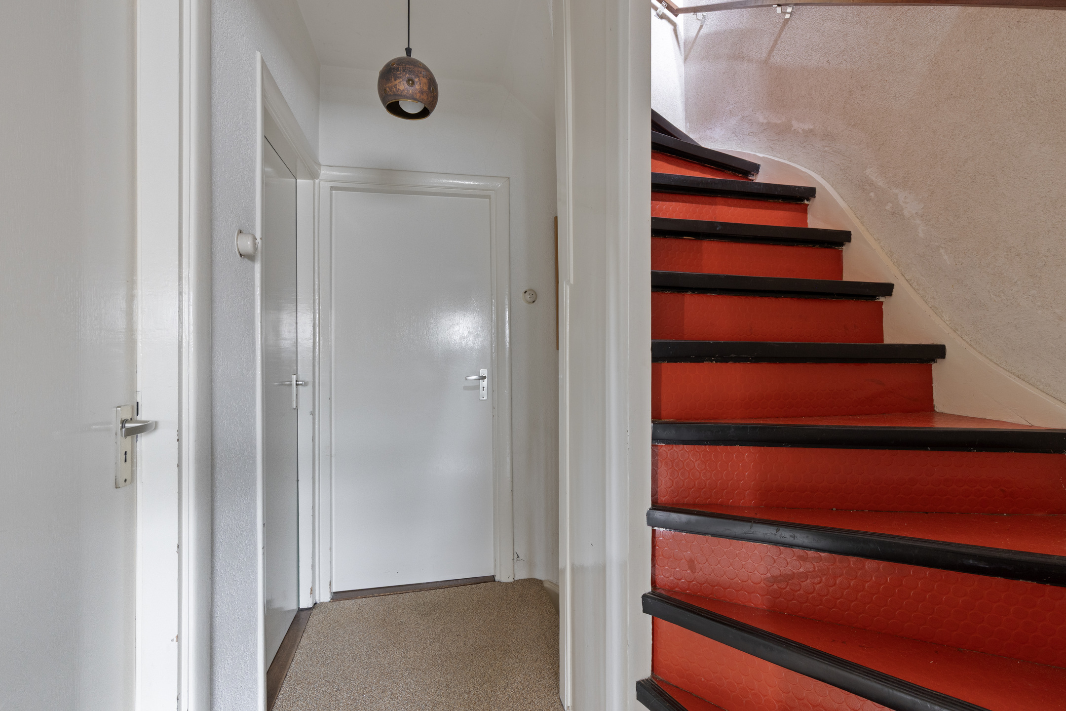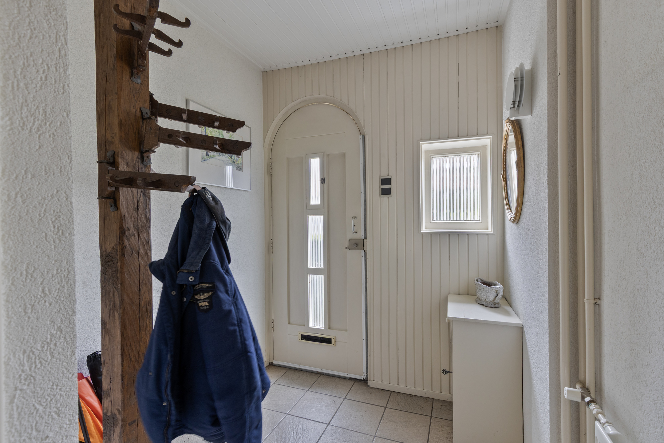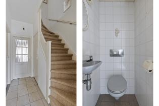 Via de groene voortuin, die eventueel als oprit gebruikt kan worden, bereiken we de voordeur. In de hal bevinden zich de toiletruimte, trapopgang, kelder, woonkamer en keuken. De vloer is afgewerkt met tegels en de wanden met granol. De kelder is ruim, op stahoogte en verdeeld in twee compartimenten, ideaal als wijnkelder of extra opslagruimte. De toiletruimte is volledig betegeld en voorzien van een hangend toilet, fonteintje en ventilatie.