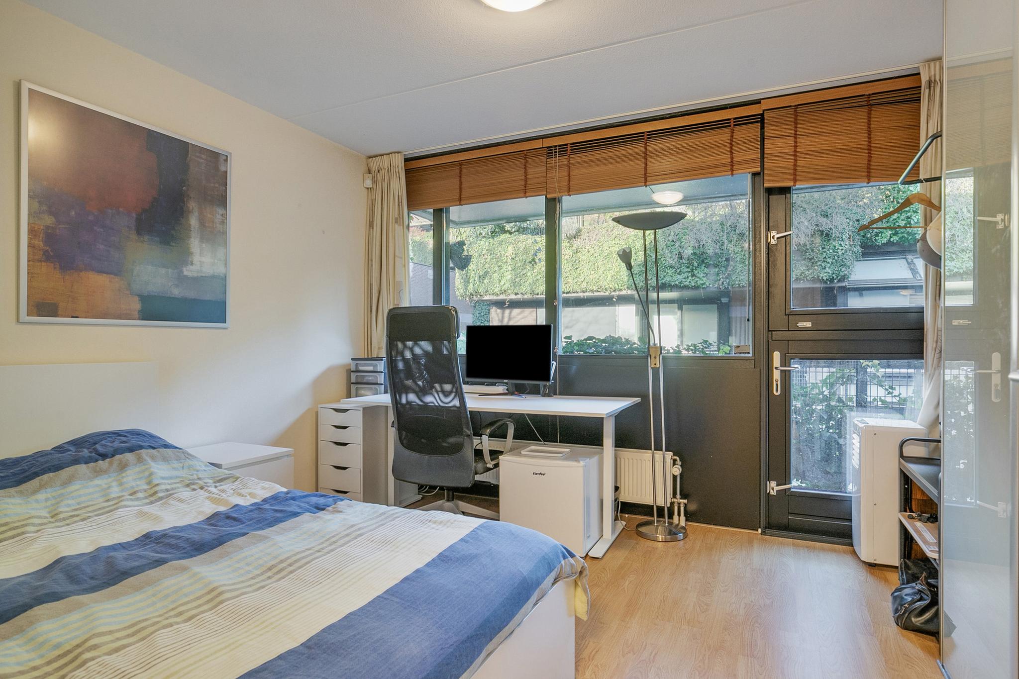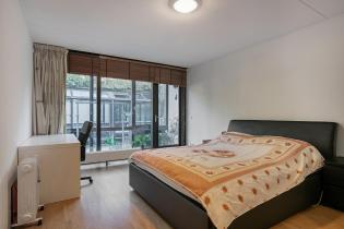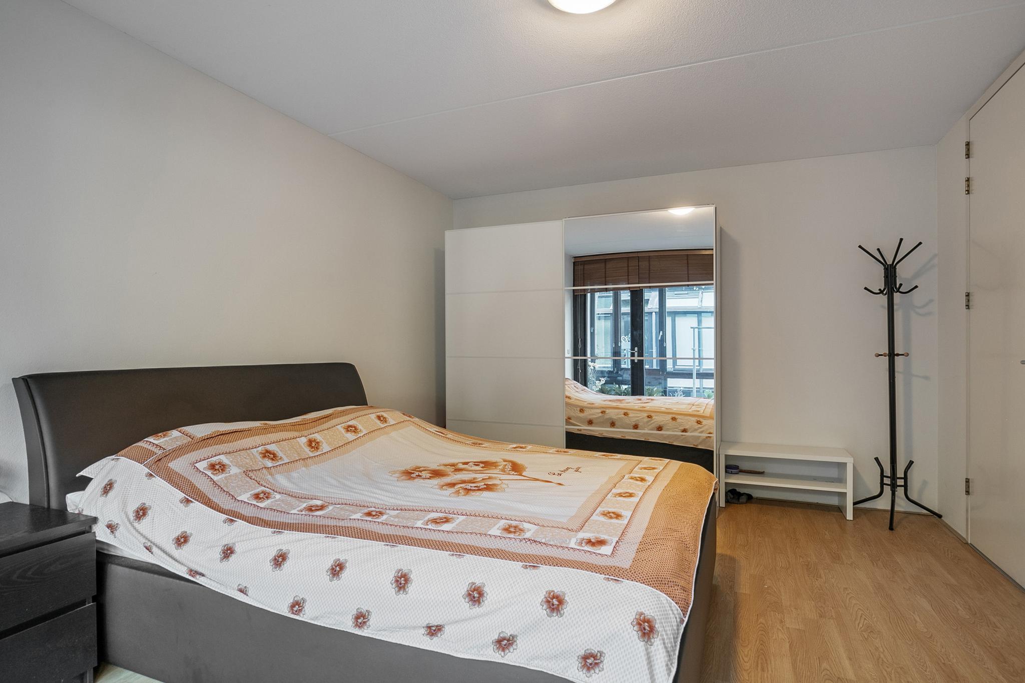 The first bedroom (approx. 18 m²) is very spacious and located at the front. It features a neat laminate floor and wooden window frames with HR++ glazing. From the front, you can access a loggia with a lovely view of this charming street.