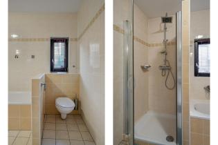 Next to the kitchen, the bathroom is located. This fully tiled space has a practical layout, featuring a shower, washbasin with a vanity unit, and a designer radiator. There is also a separate, lockable toilet area with a floating closet. The entire bathroom is finished with modern, light-colored tiles.