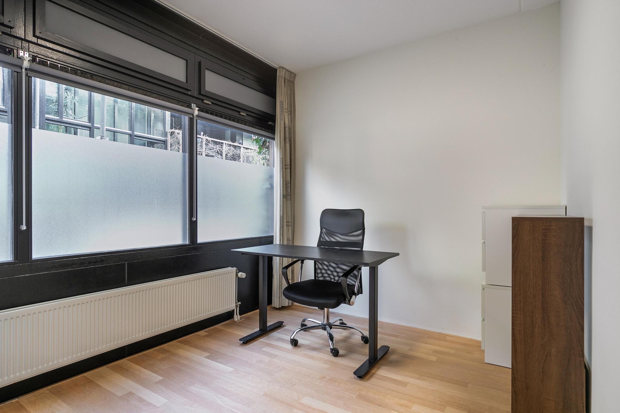 Het atelier op de begane grond is multifunctioneel te gebruiken. De ruimte is voorzien van een nette laminaatvloer en houten kozijnen met HR++-beglazing.