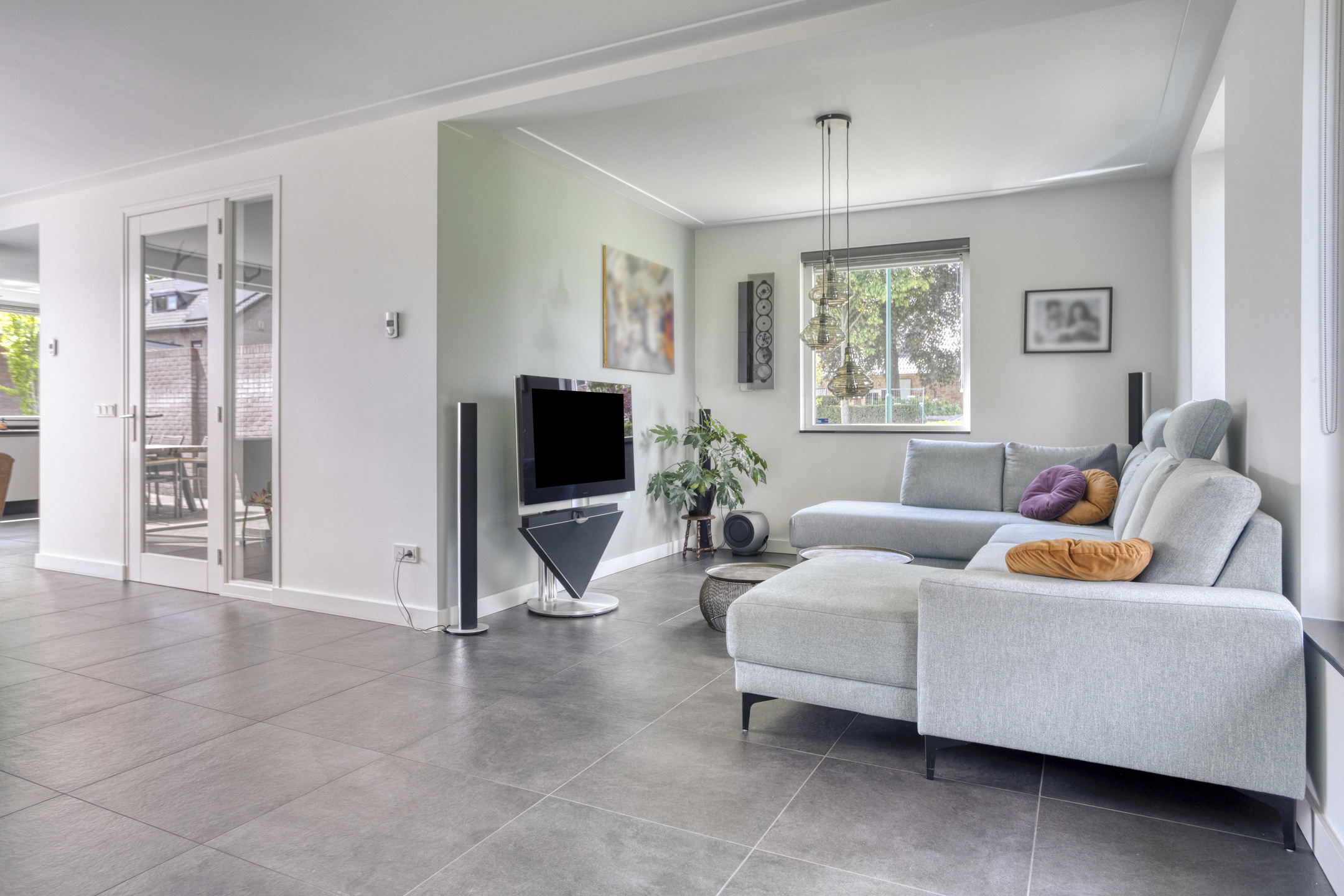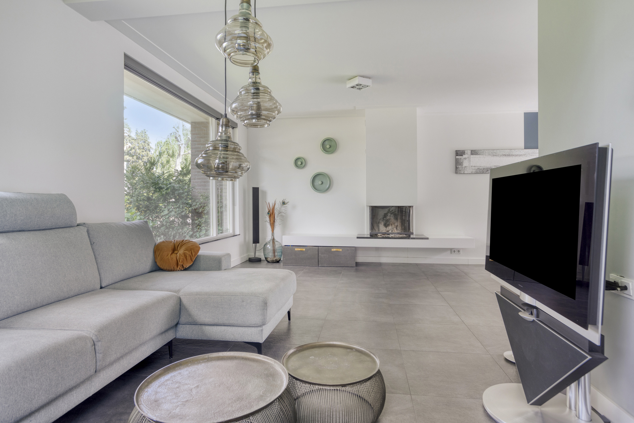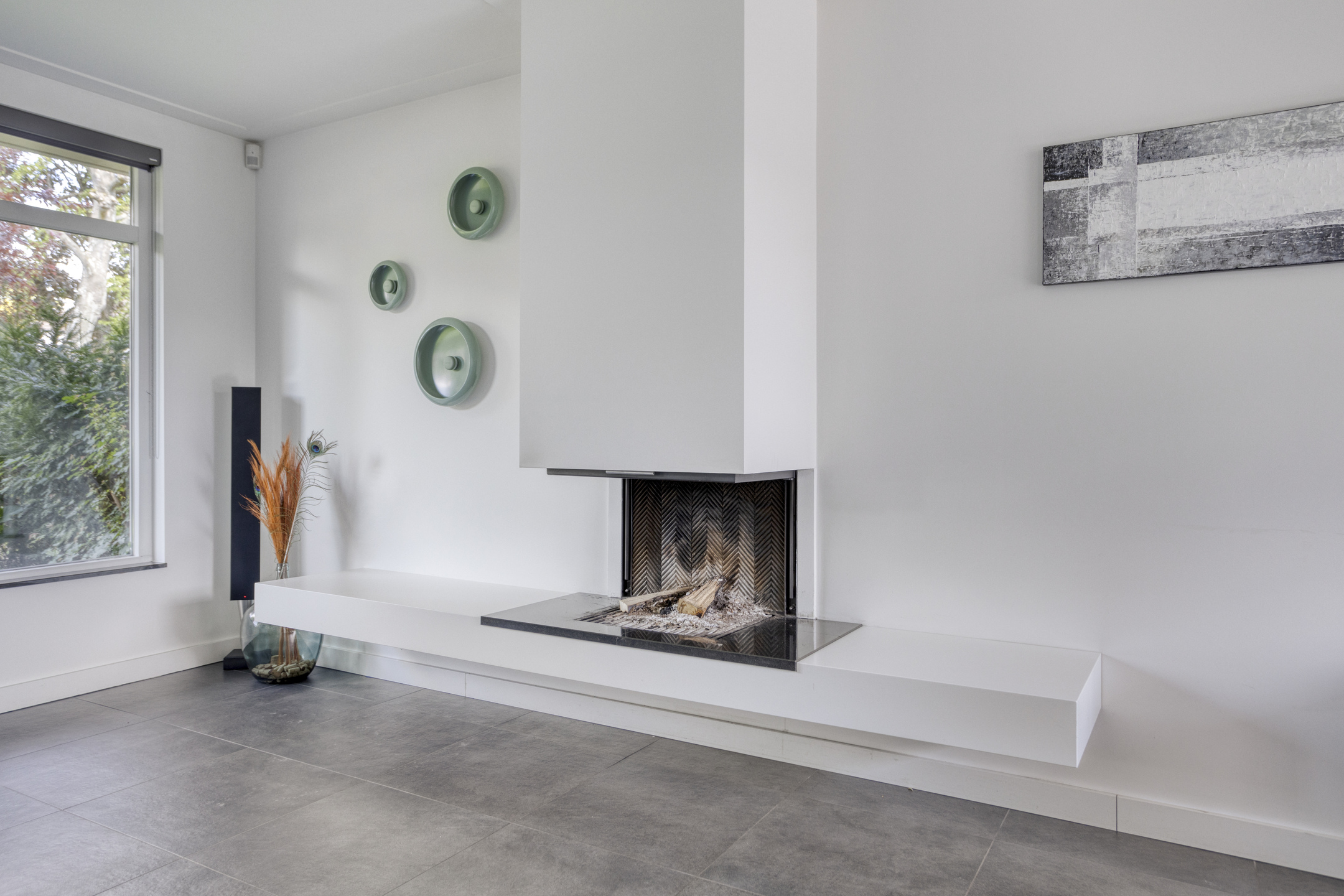 De ruime L-vormige woonkamer is voorzien van een moderne grijze tegelvloer met vloerverwarming, een strakke afwerking en een sfeervolle, moderne zwevende haard. Dankzij de grote raampartijen aan de voorzijde is er veel natuurlijk lichtinval en zicht op het groen. Aan de achterzijde geven openslaande tuindeuren toegang tot de royale tuin. De woonkamer staat in directe verbinding met de keuken.