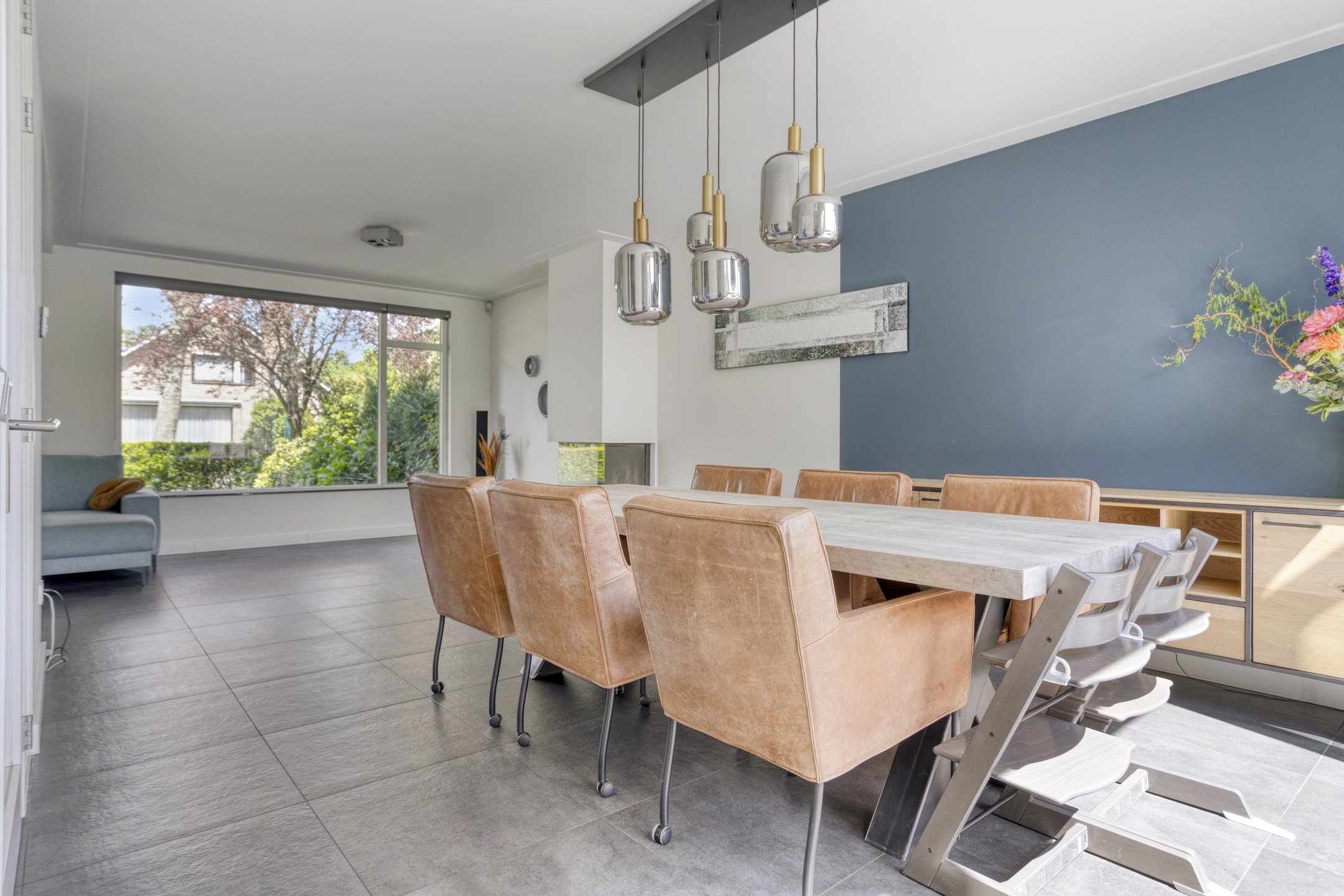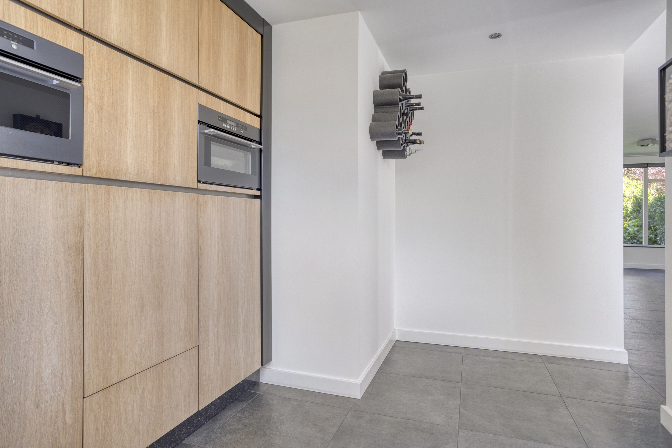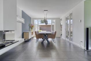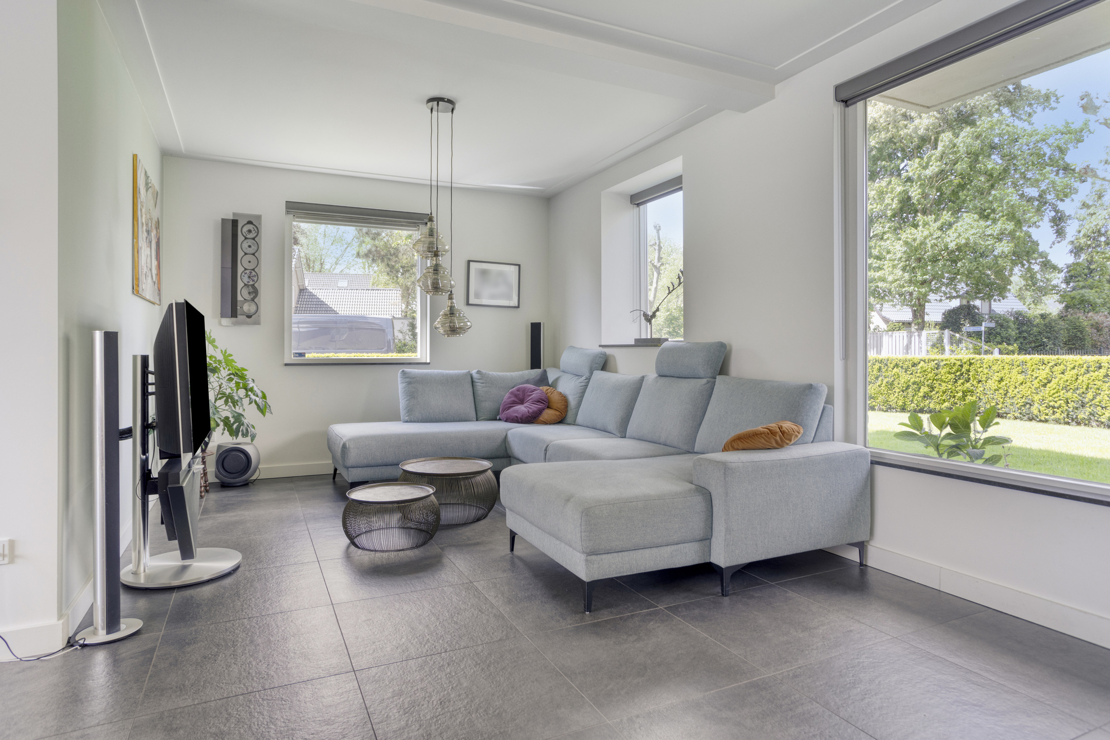 De ruime L-vormige woonkamer is voorzien van een moderne grijze tegelvloer met vloerverwarming, een strakke afwerking en een sfeervolle, moderne zwevende haard. Dankzij de grote raampartijen aan de voorzijde is er veel natuurlijk lichtinval en zicht op het groen. Aan de achterzijde geven openslaande tuindeuren toegang tot de royale tuin. De woonkamer staat in directe verbinding met de keuken.