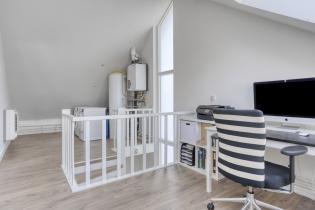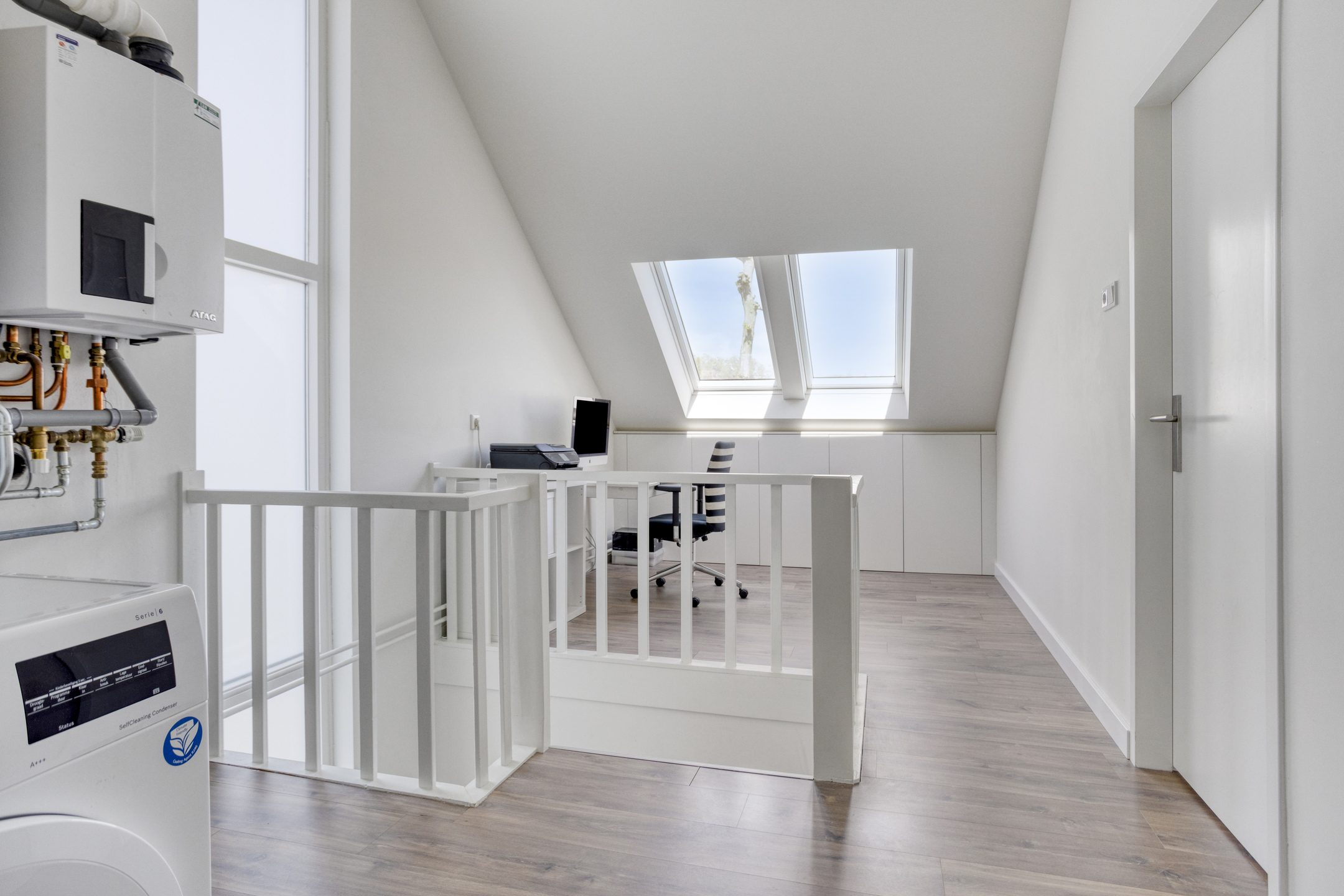 De vaste houten trap brengt je naar de tweede verdieping. Op de voorzolder bevinden zich de aansluitingen voor wasapparatuur, de cv-installatie én de boilerunit met zonnecollector. Twee dakramen zorgen voor prettig daglicht, en er is voldoende ruimte voor een werkplek of kantoorgedeelte.
