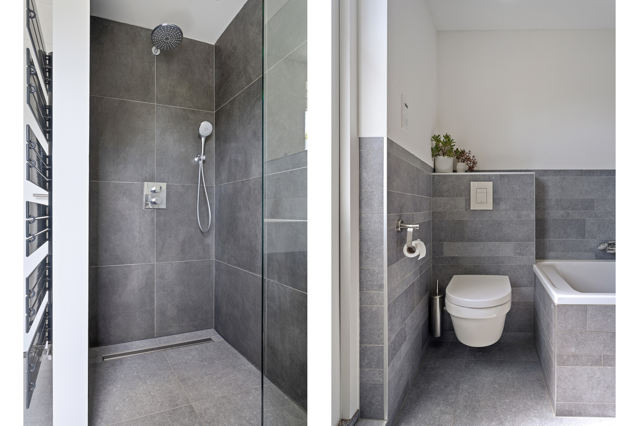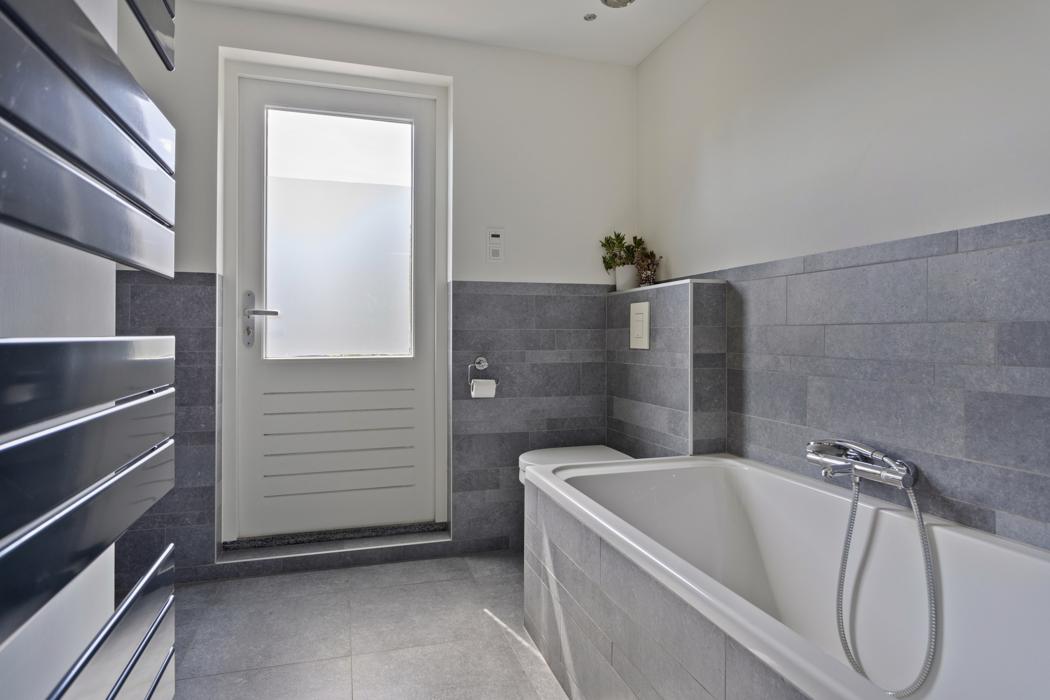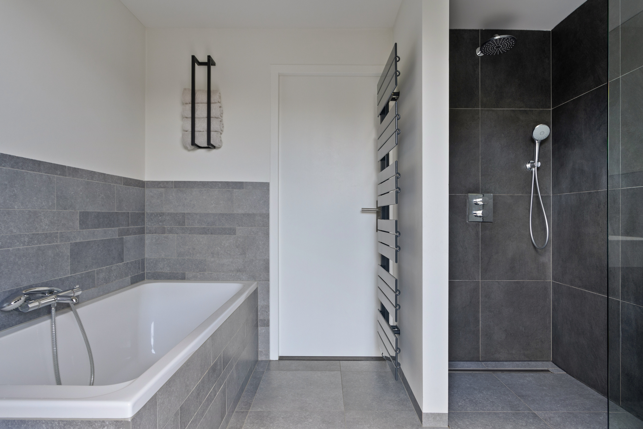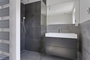 De moderne badkamer is half betegeld en uitgerust met een ligbad, inloopdouche met glaswand, zwevend toilet, wastafelmeubel, designradiator, vloerverwarming, inbouwspots en een deur naar het balkon. De afwerking is strak en fris.