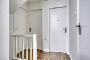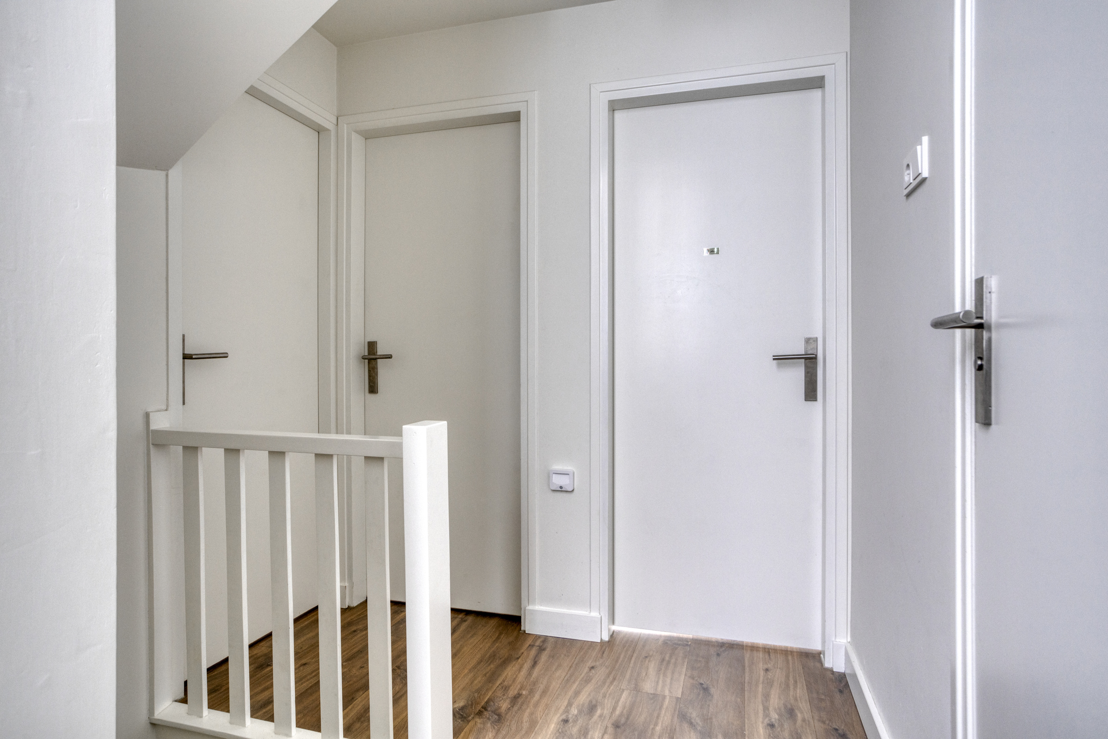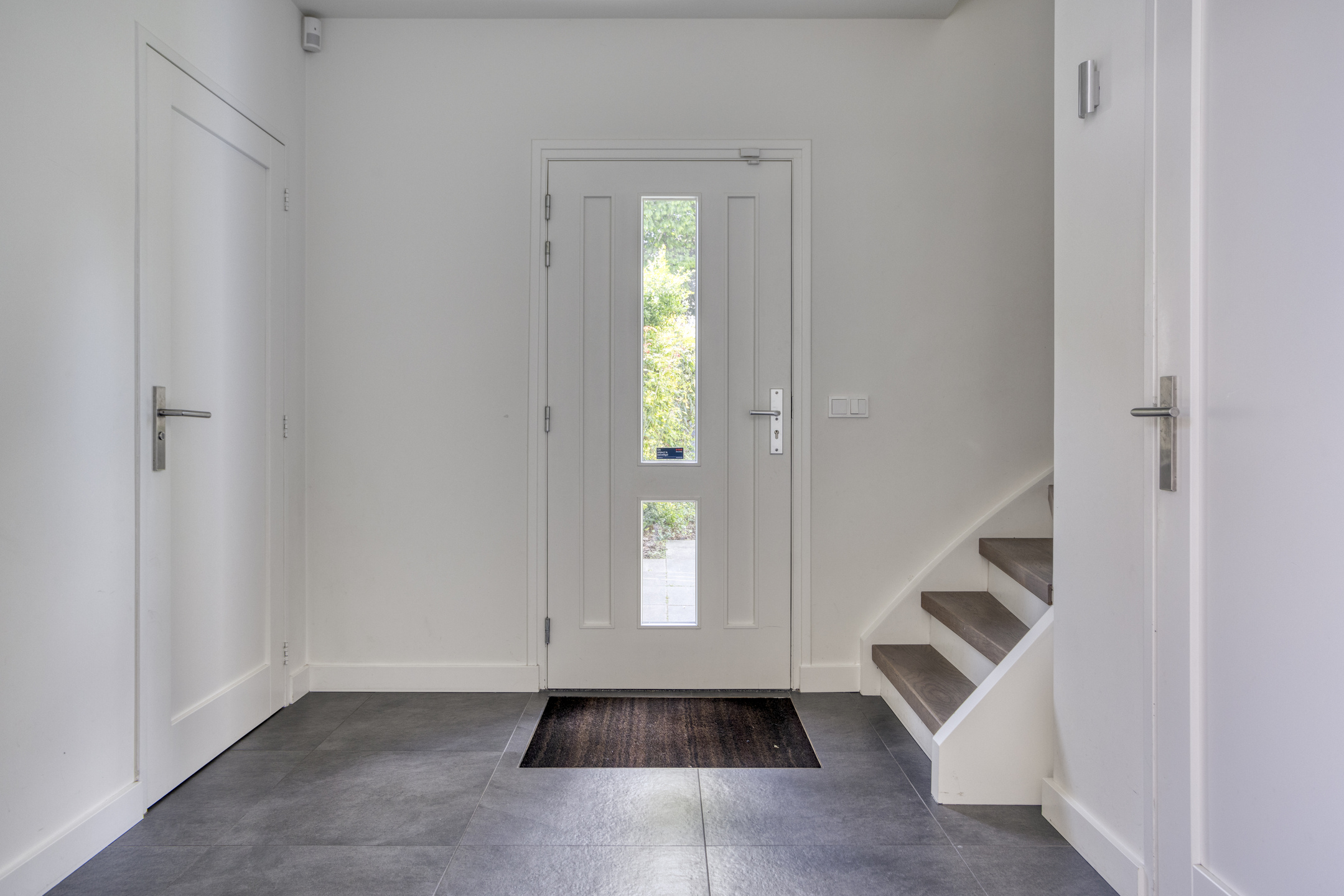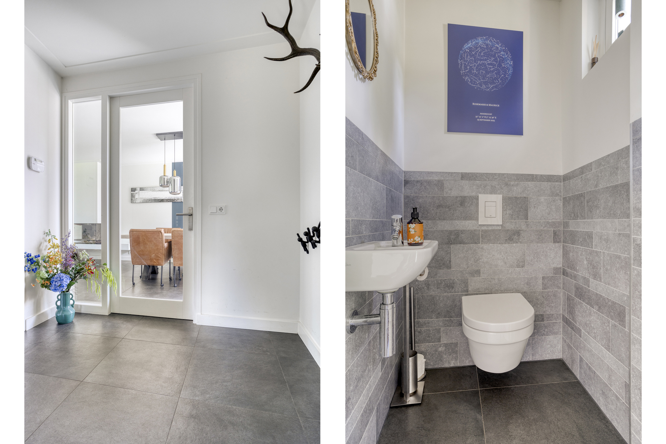 Via de groene voortuin bereik je de zij-entree van de woning. In de hal tref je een modern half betegeld toilet met zwevend closet, fonteintje en een raam voor natuurlijke ventilatie. Onder de trap is een praktische bergruimte met de meterkast.