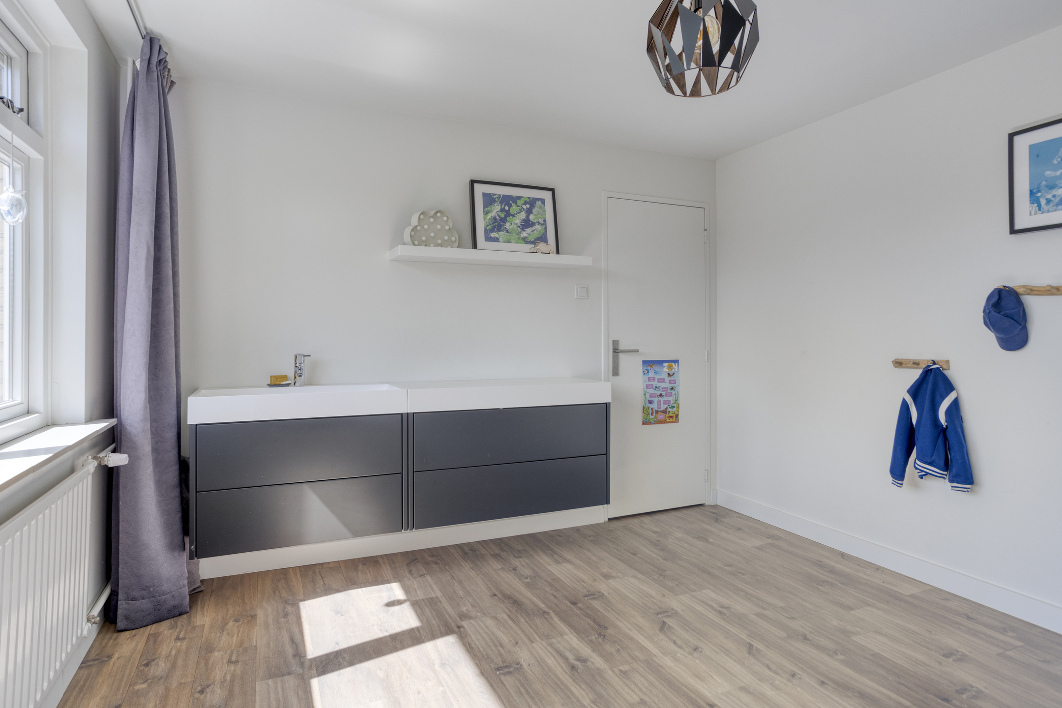 De vierde slaapkamer is ruim en sfeervol, met een hoog plafond, een groot dakkapel met zonwerende jaloezieën, drie Velux dakramen met screens, ingebouwde kastruimte achter knieschotten, houten kozijnen met dubbel glas, inbouwspots en een wastafelmeubel.