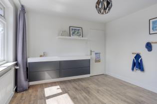 De tweede slaapkamer is eveneens voorzien van een wastafelmeubel, extra opbergmeubel en een draairaam.
