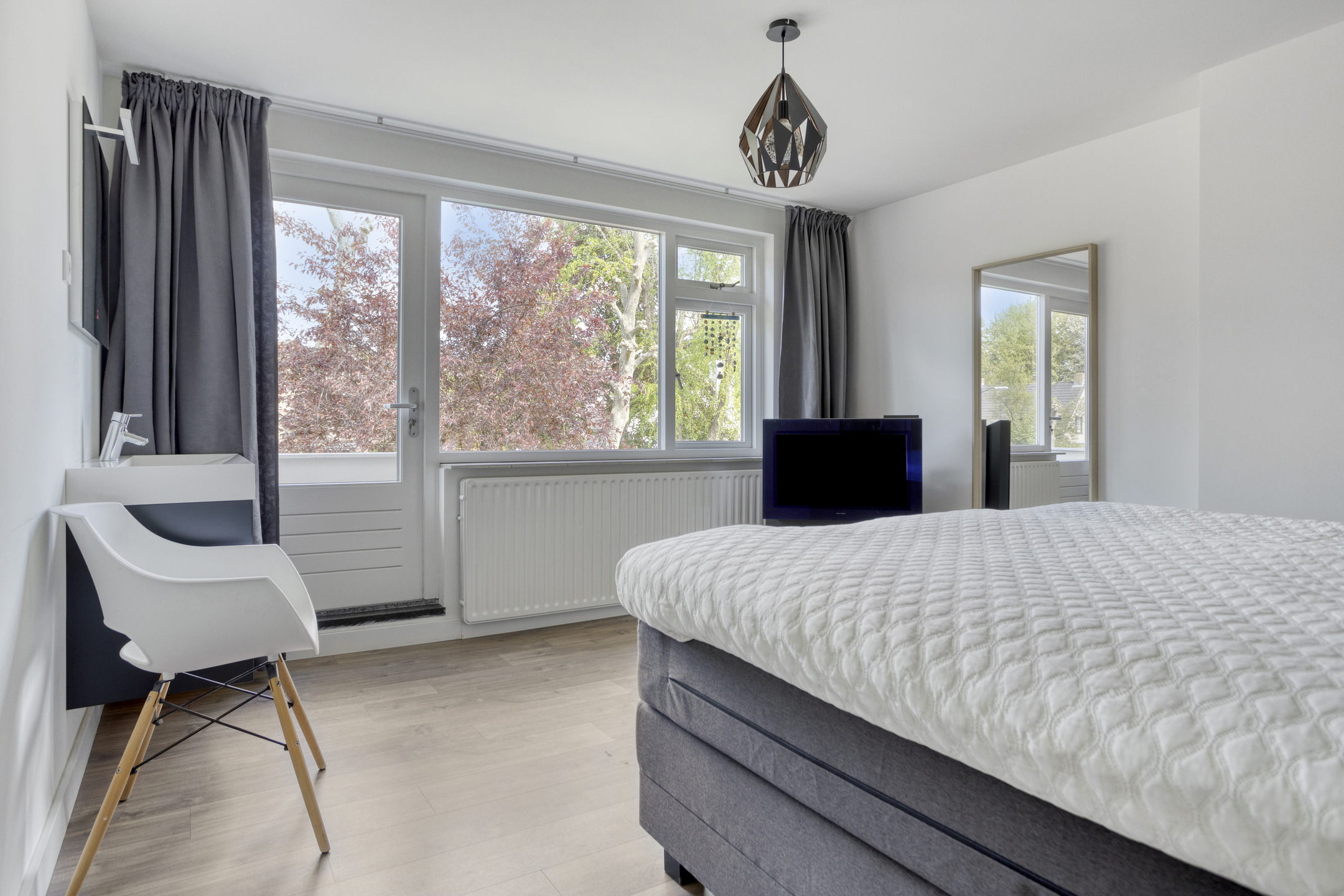 De grootste slaapkamer aan de voorzijde beschikt over een eigen balkon met uitzicht op de straat, een inbouwkast, wastafelmeubel met spiegelverlichting, houten kozijnen, dubbel glas en radiatoren.