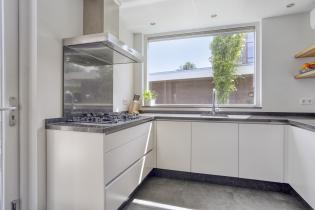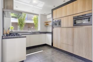 De open keuken is uitgevoerd in een praktische U-opstelling en voorzien van hoogwaardige inbouwapparatuur zoals een 5-pits gaskookplaat, oven, stoomoven, vaatwasser, koelkast en afzuigkap. Daarnaast is er airconditioning, een groot raam met zicht op de tuin, elektrische screens en een ingebouwde opbergkast met moderne houtafwerking. Ook vanuit de keuken is er toegang tot de achtertuin.