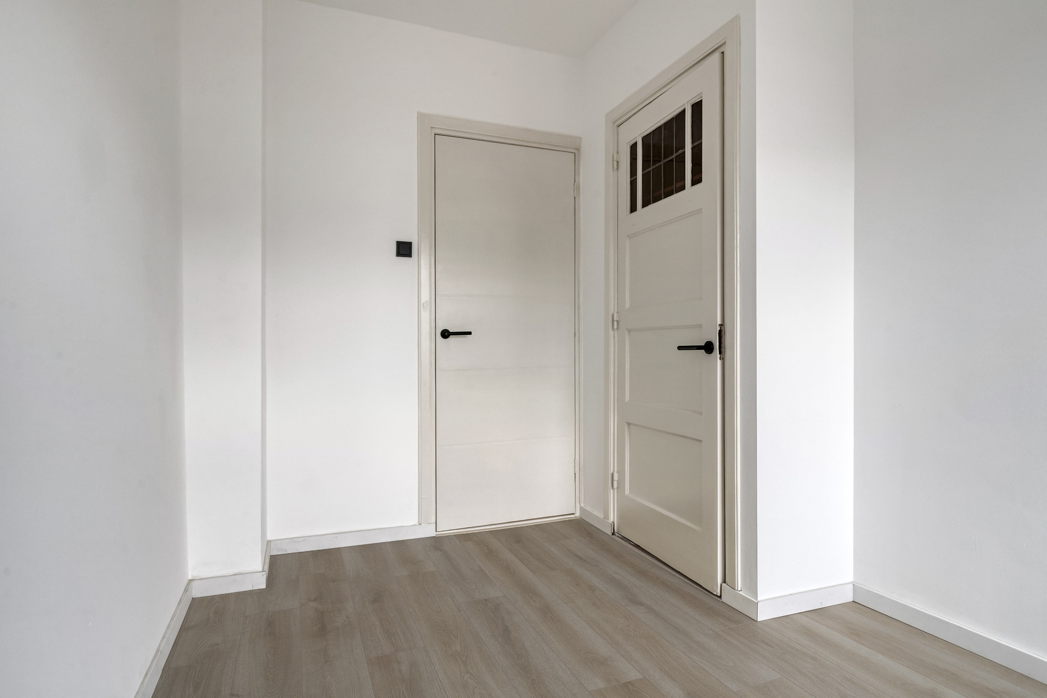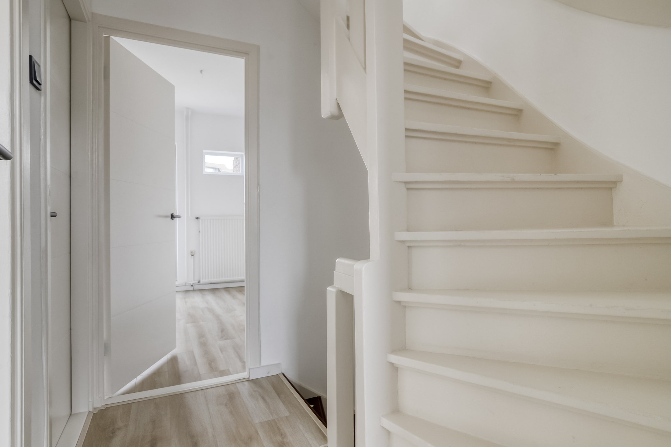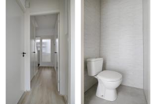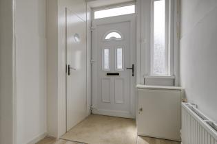 We betreden de woning via het tochtportaal, waar ook de meterkast te vinden is. Vanuit hier lopen we door naar de hal met trapopgang, toiletruimte en toegang tot zowel de woonkamer als de keuken.