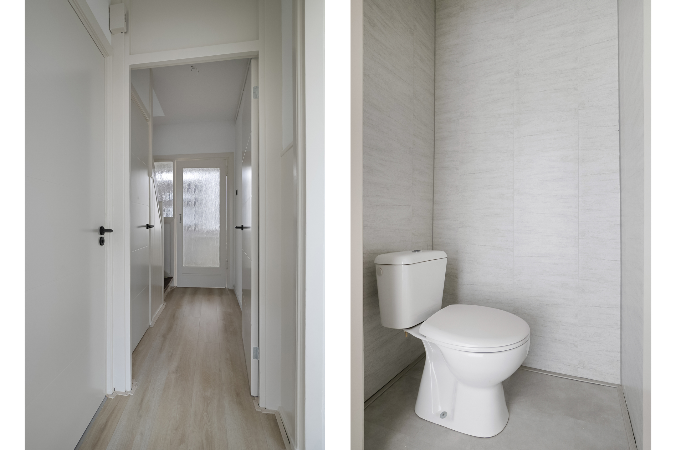 De begane grond is netjes afgewerkt met een laminaatvloer, glad gestucte wanden en plafonds. De toiletruimte is voorzien van een laminaatvloer, kunststof wandafwerking en een staand toilet.