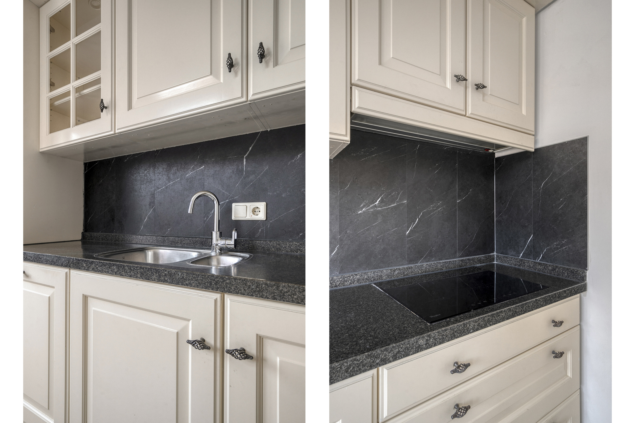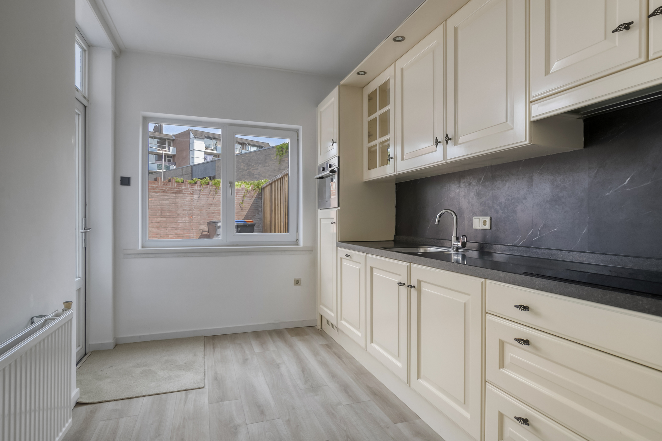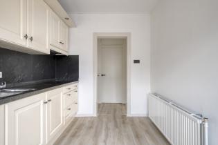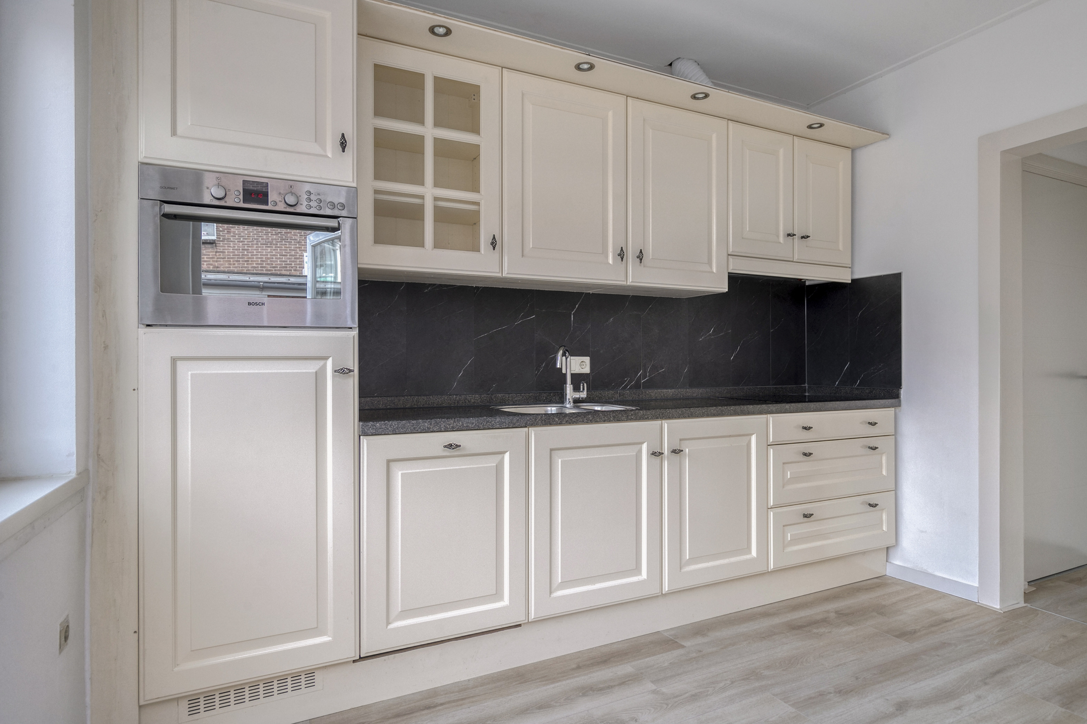 De woonkamer is heerlijk licht dankzij de grote raampartijen en biedt voldoende ruimte voor een royale zithoek én een ruime eettafel. De keuken bevindt zich in een aparte ruimte en is uitgevoerd in een rechte opstelling met diverse inbouwapparatuur, waaronder een koelkast, combi-oven, inductiekookplaat en afzuigkap.