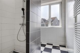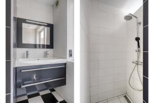 • Moderne, volledig betegelde badkamer met inloopdouche en dubbele wastafel