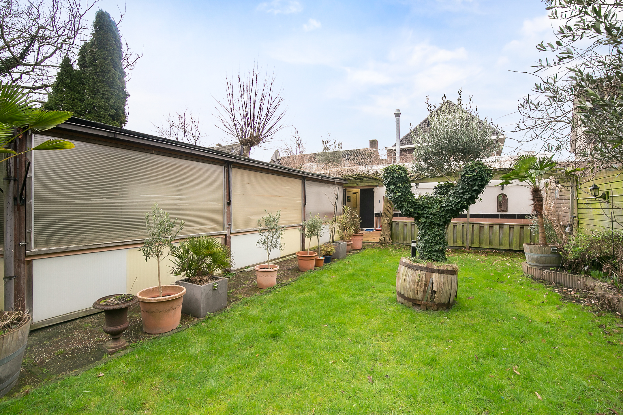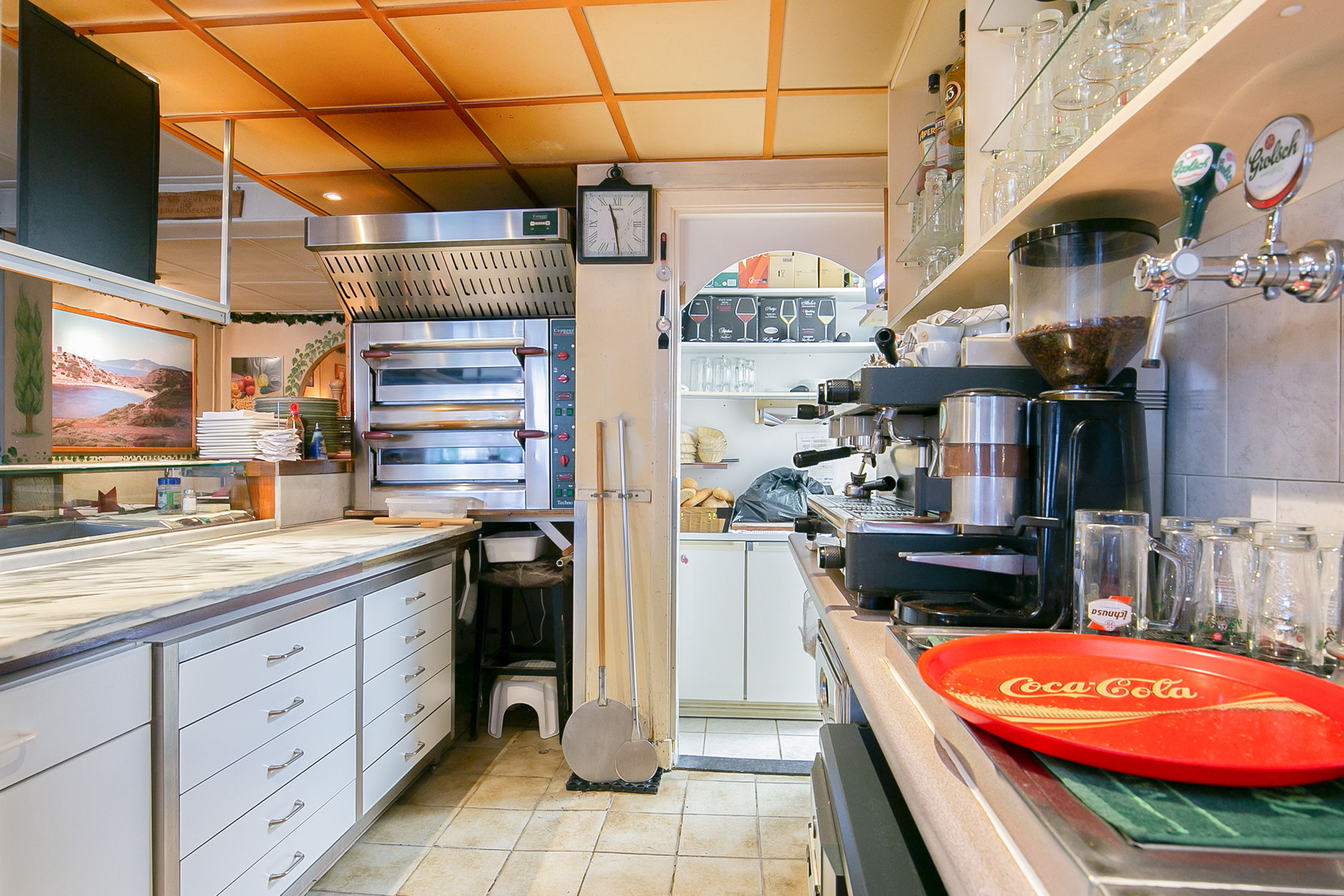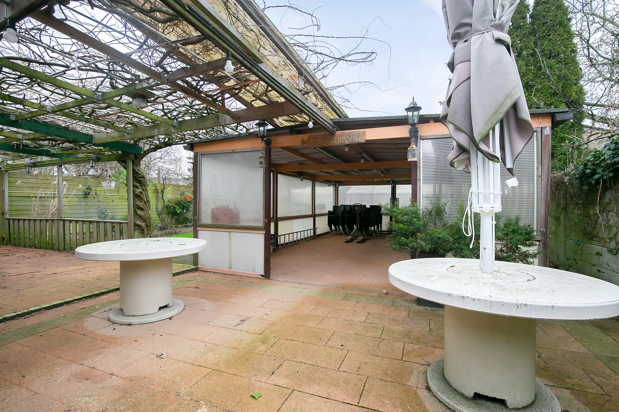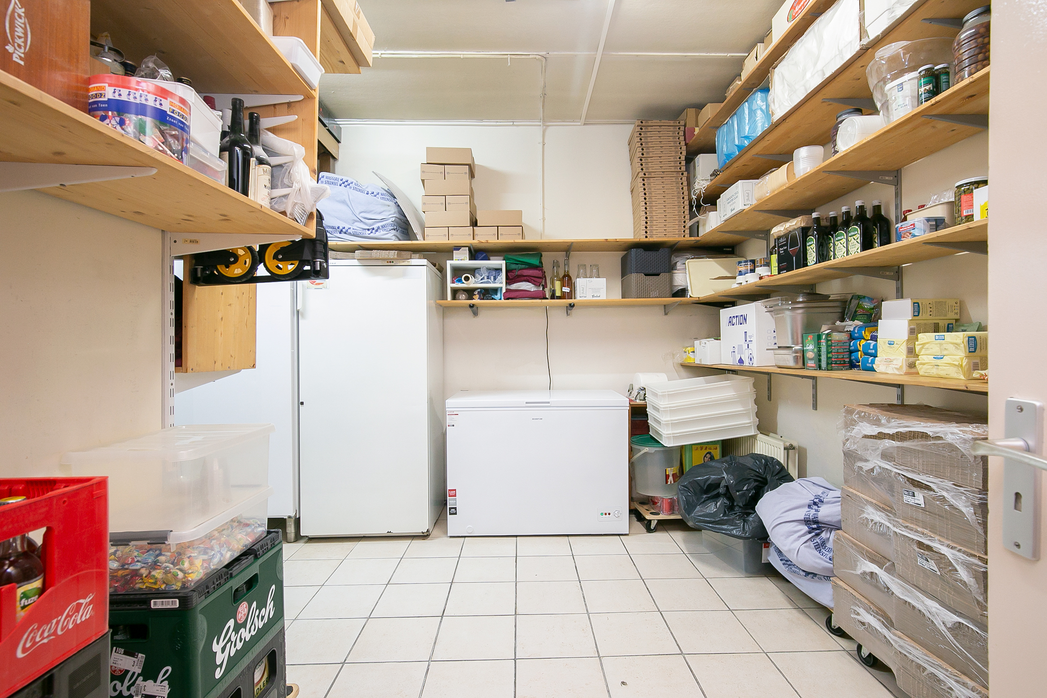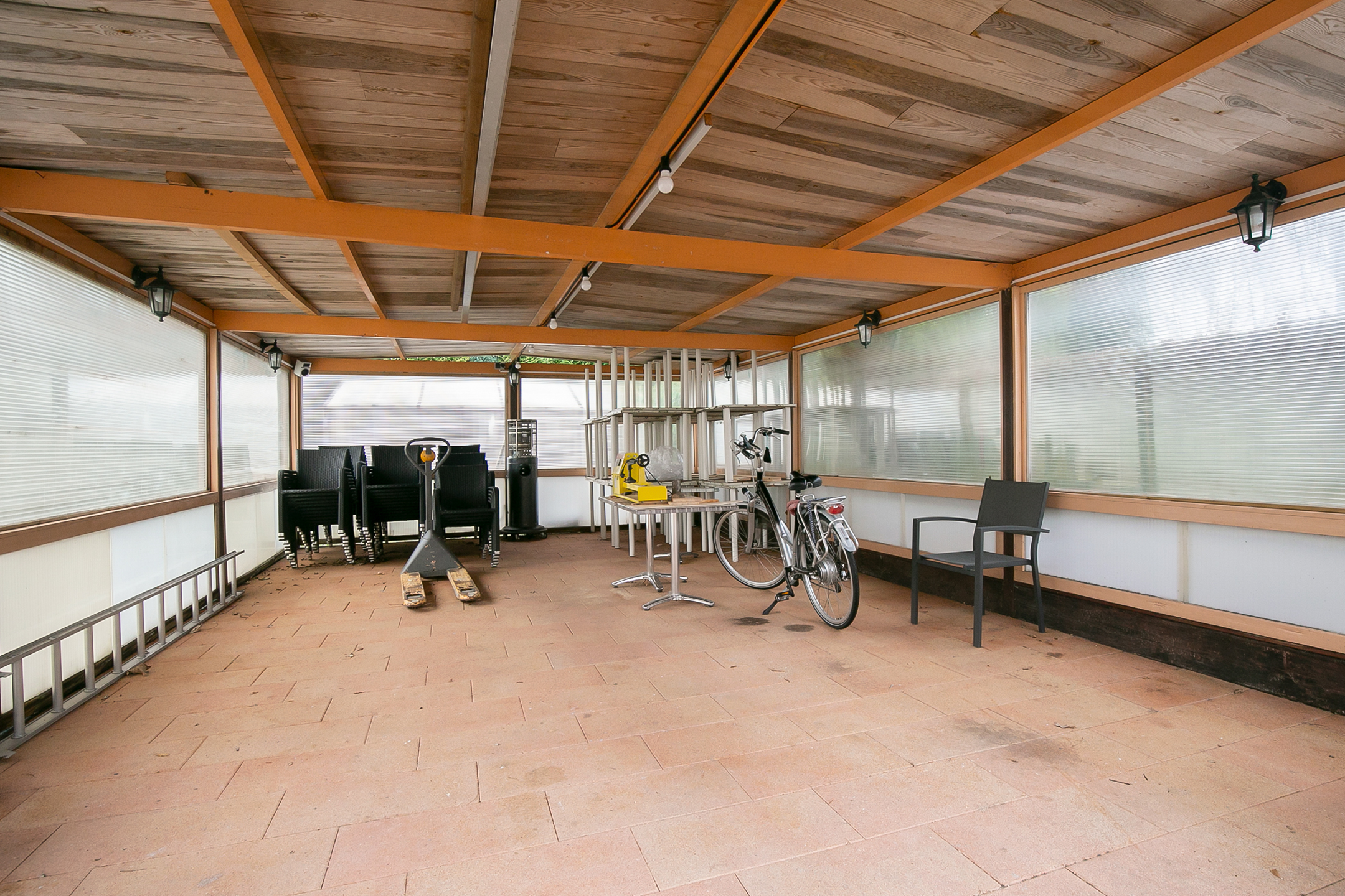 De achter-hal leidt naar een ruim magazijn met een koelcel, en een portaal met fonteintje en twee toiletten. Een extra hal met bergruimte, cv-ketel en openslaande deuren naar de achtertuin voegt extra veelzijdigheid toe aan het geheel. De uitgestrekte tuin biedt niet alleen een groot overdekt terras maar ook de mogelijkheid om een doorgang te creëren naar het parkeerterrein aan de achterzijde, ideaal voor wie zijn eigen voertuig op eigen terrein wil parkeren.