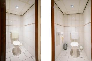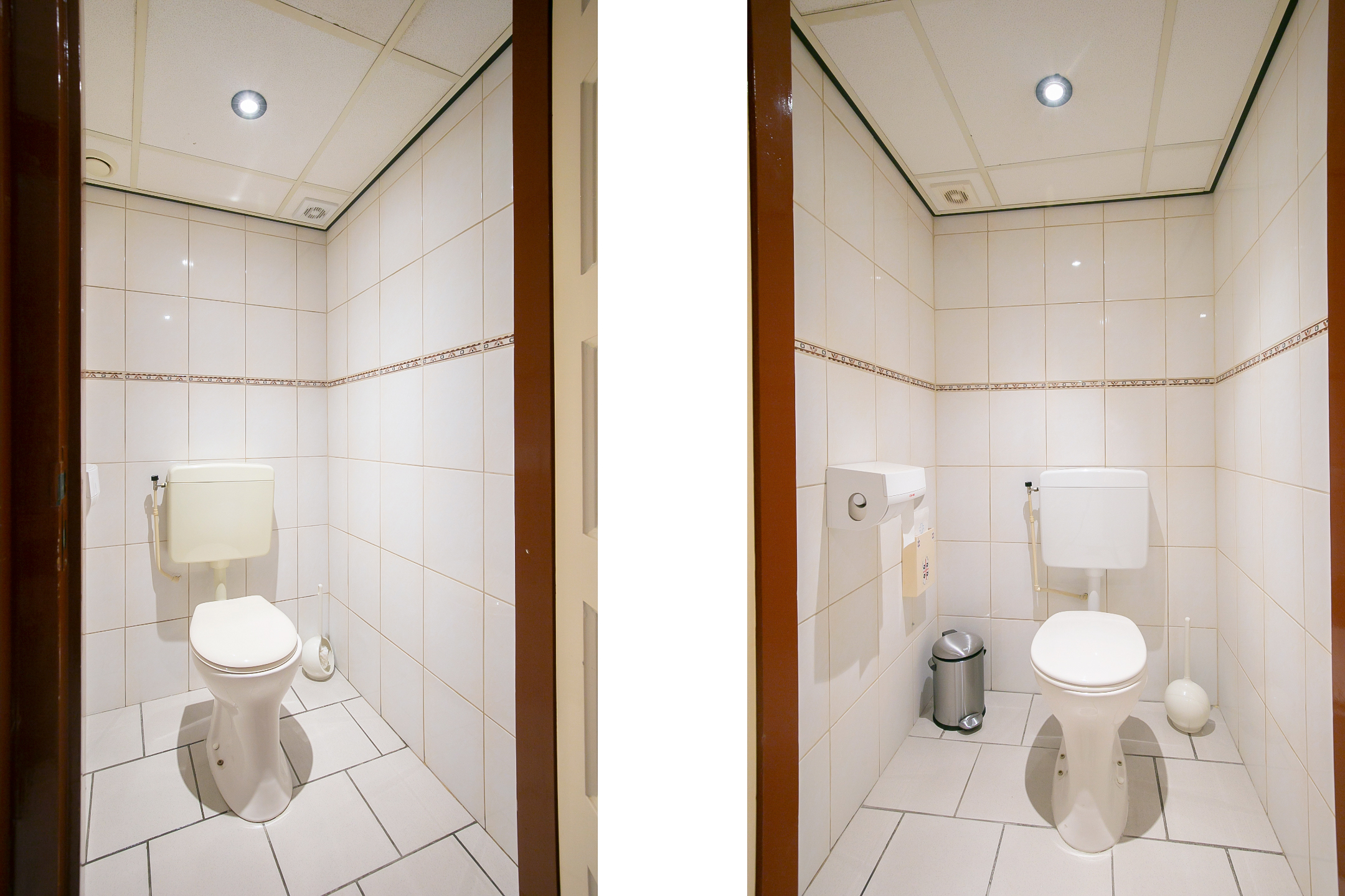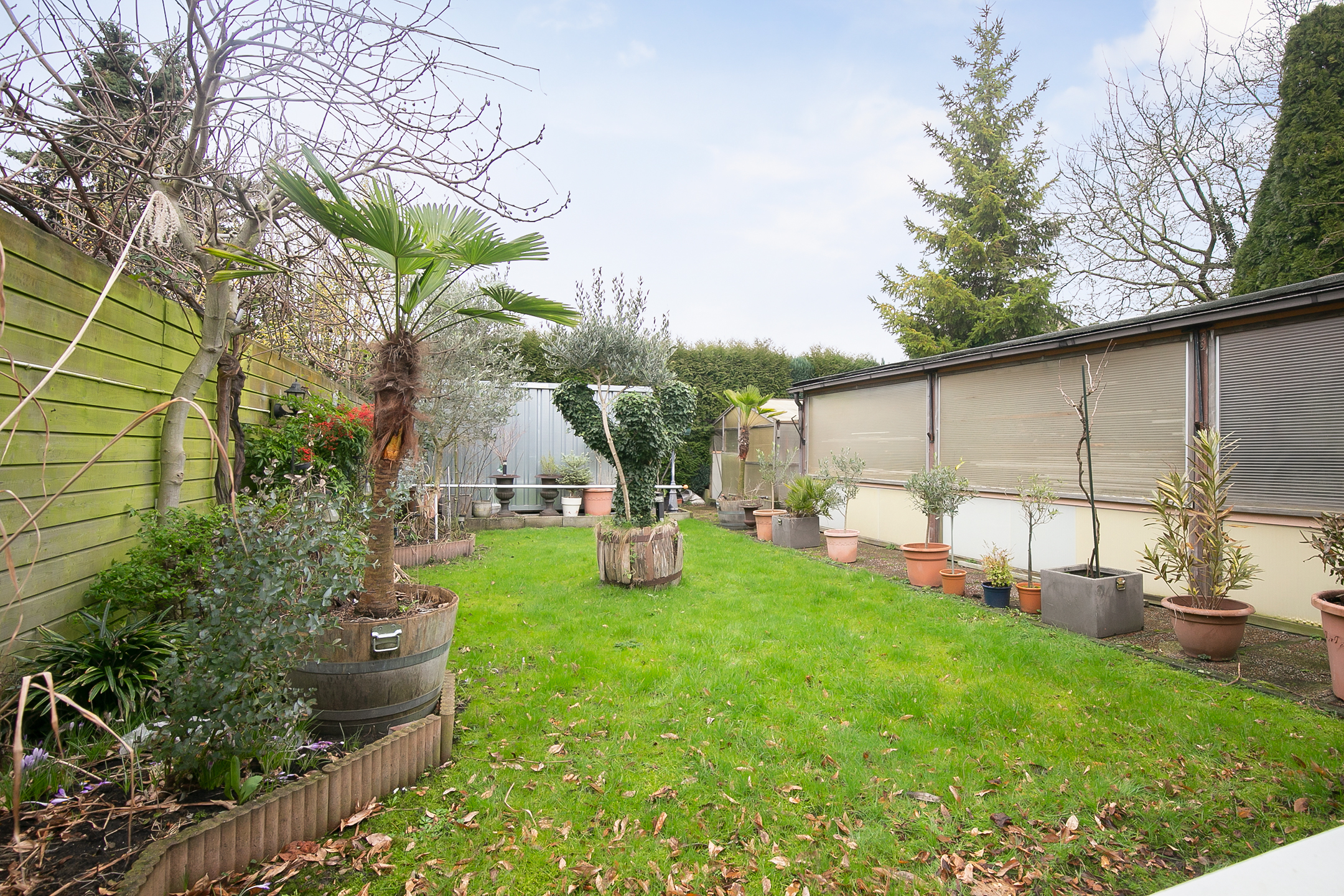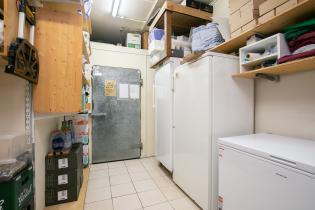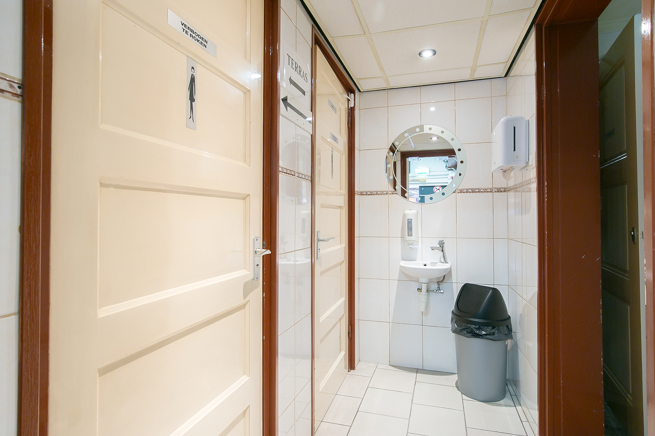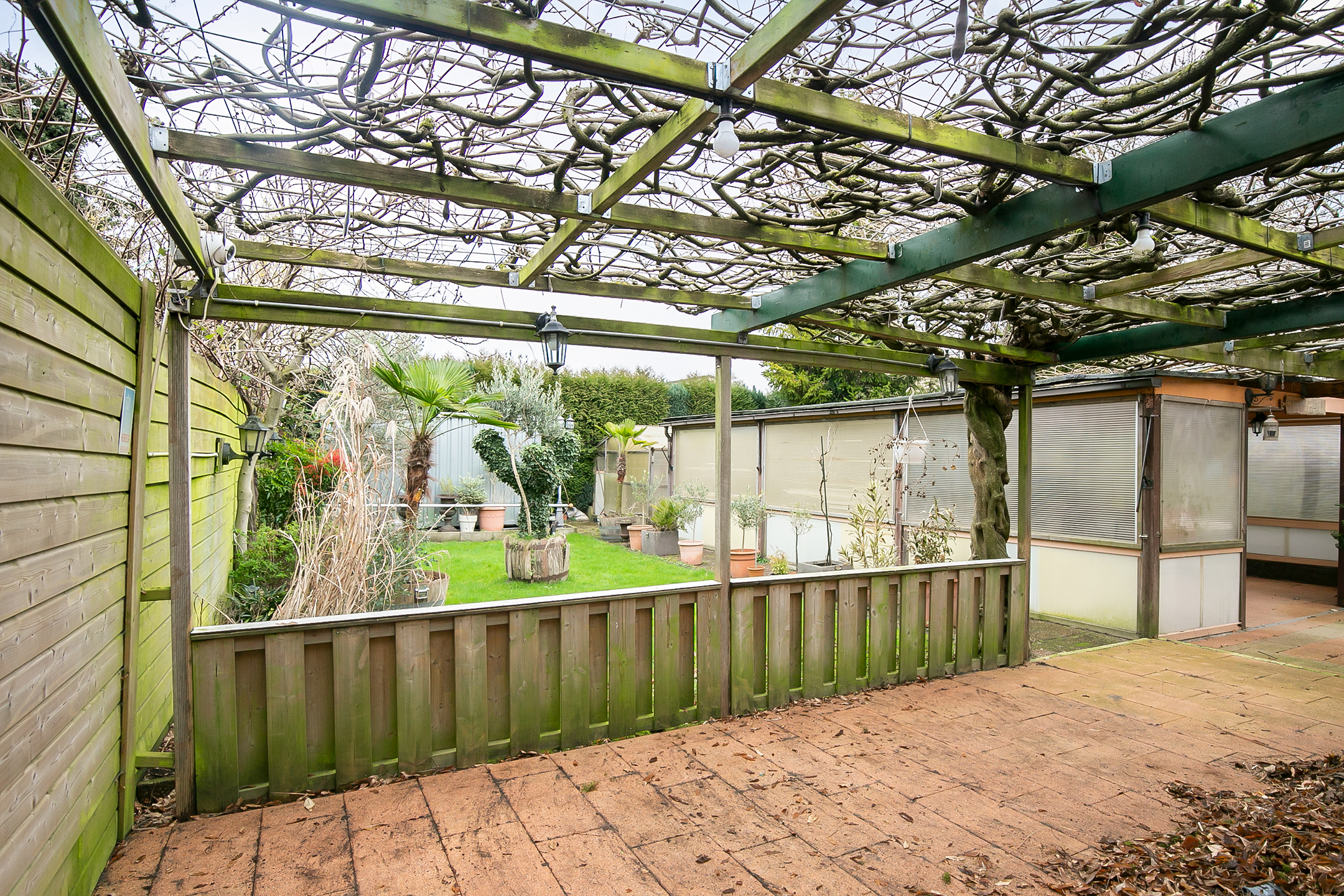 De achter-hal leidt naar een ruim magazijn met een koelcel, en een portaal met fonteintje en twee toiletten. Een extra hal met bergruimte, cv-ketel en openslaande deuren naar de achtertuin voegt extra veelzijdigheid toe aan het geheel. De uitgestrekte tuin biedt niet alleen een groot overdekt terras maar ook de mogelijkheid om een doorgang te creëren naar het parkeerterrein aan de achterzijde, ideaal voor wie zijn eigen voertuig op eigen terrein wil parkeren.