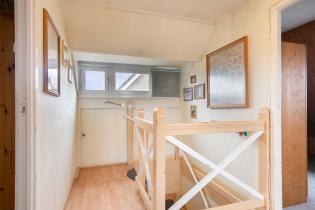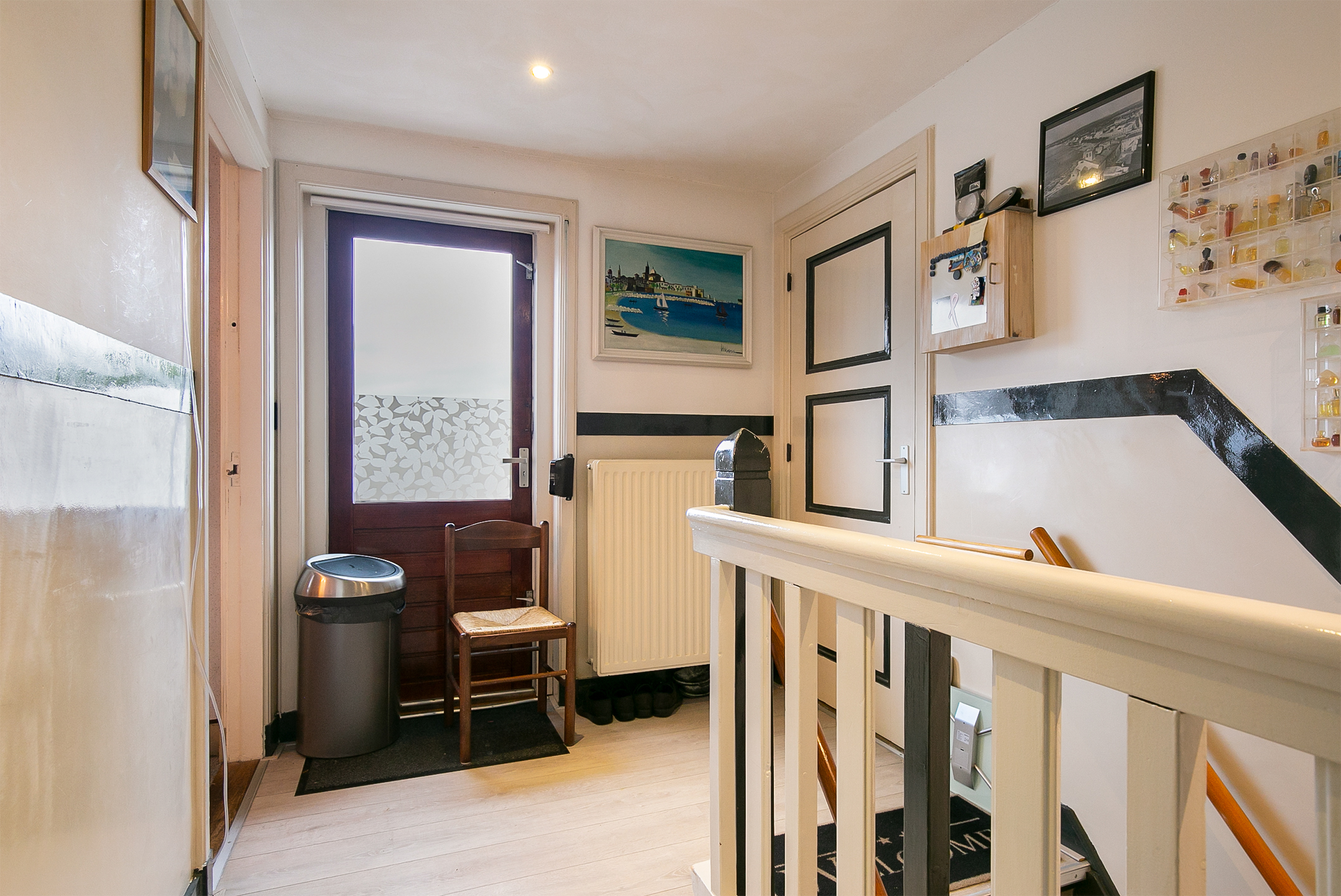 De eerste verdieping omvat een overloop met muurkast en toegang tot het platte dak, een slaapkamer aan de achterzijde met muurkast en een woonkamer aan de voorzijde met erker en open keuken, voorzien van onder- en bovenkasten.