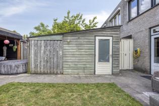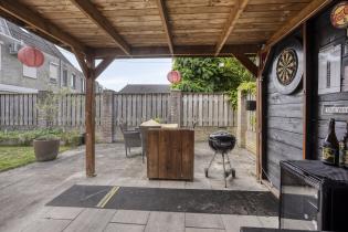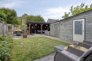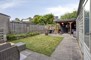 Naast diverse terrassen beschikt de praktische achtertuin over een dubbele houten berging en een achterom.
