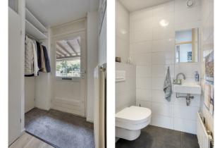 A back door from the kitchen opens to the west-facing rear garden. Directly adjacent to the house is a spacious terrace with a sun awning. The paved path runs past a lawn and planted borders to a second terrace at the back, where you will also find a stylish covered seating area ideal for outdoor lounging.