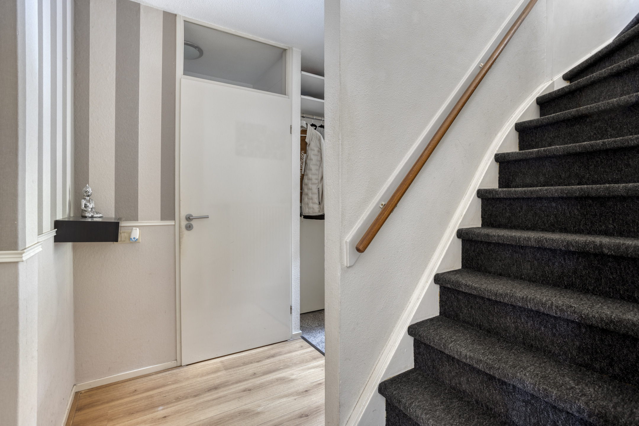 Through the covered entrance, you enter the hallway, finished with a stylish laminate floor. The hall offers access to the modern toilet, the staircase to the first floor, and the living room.
