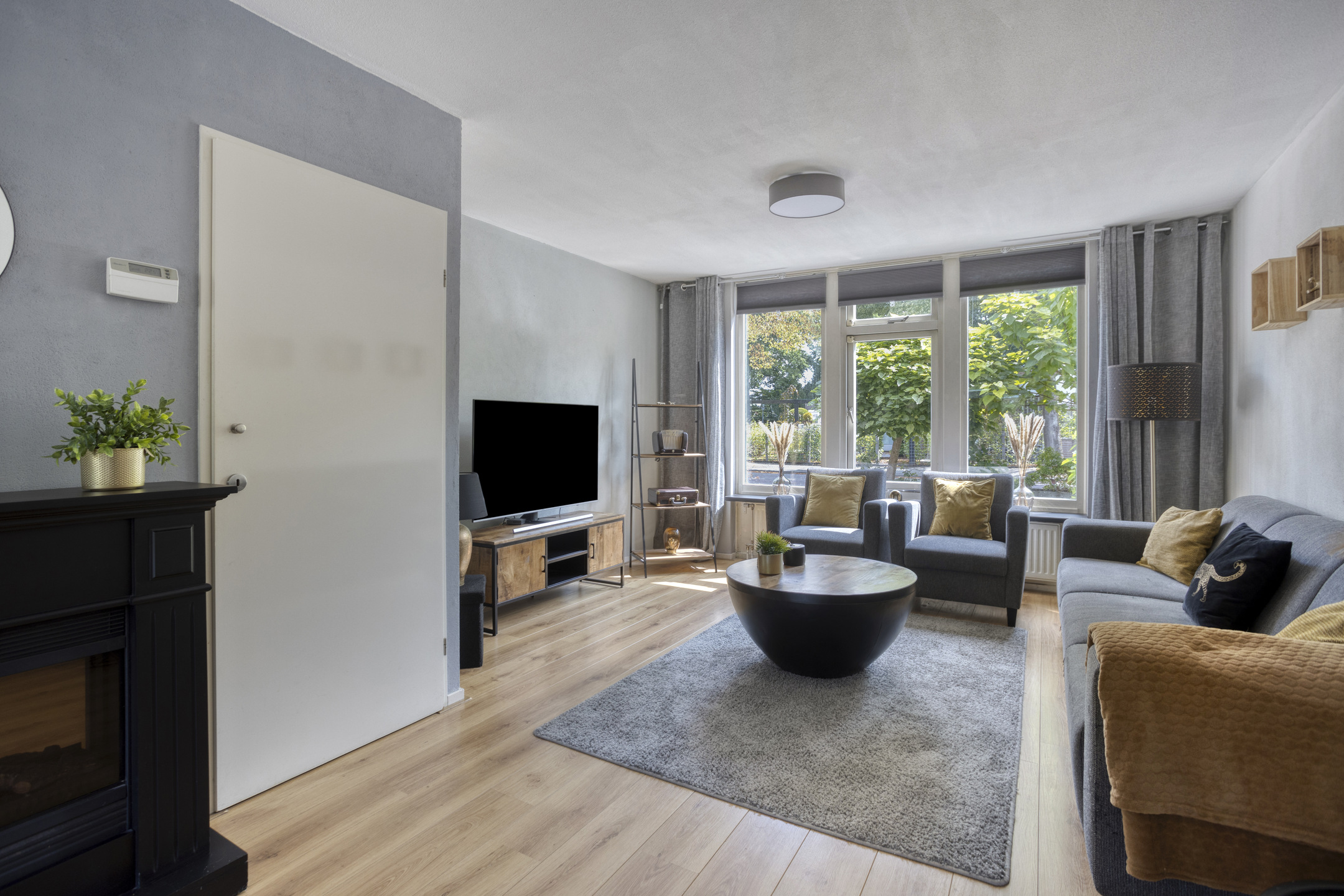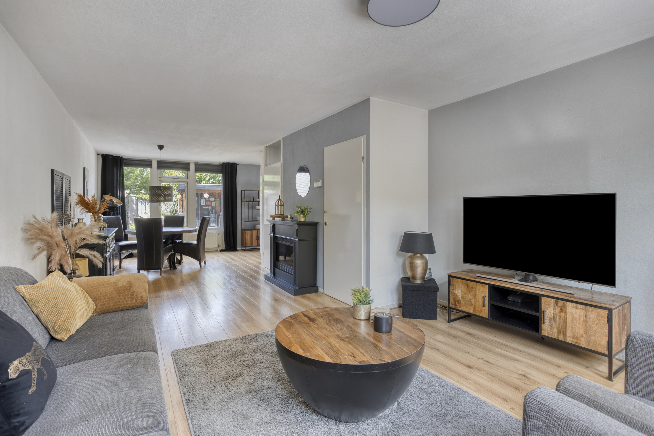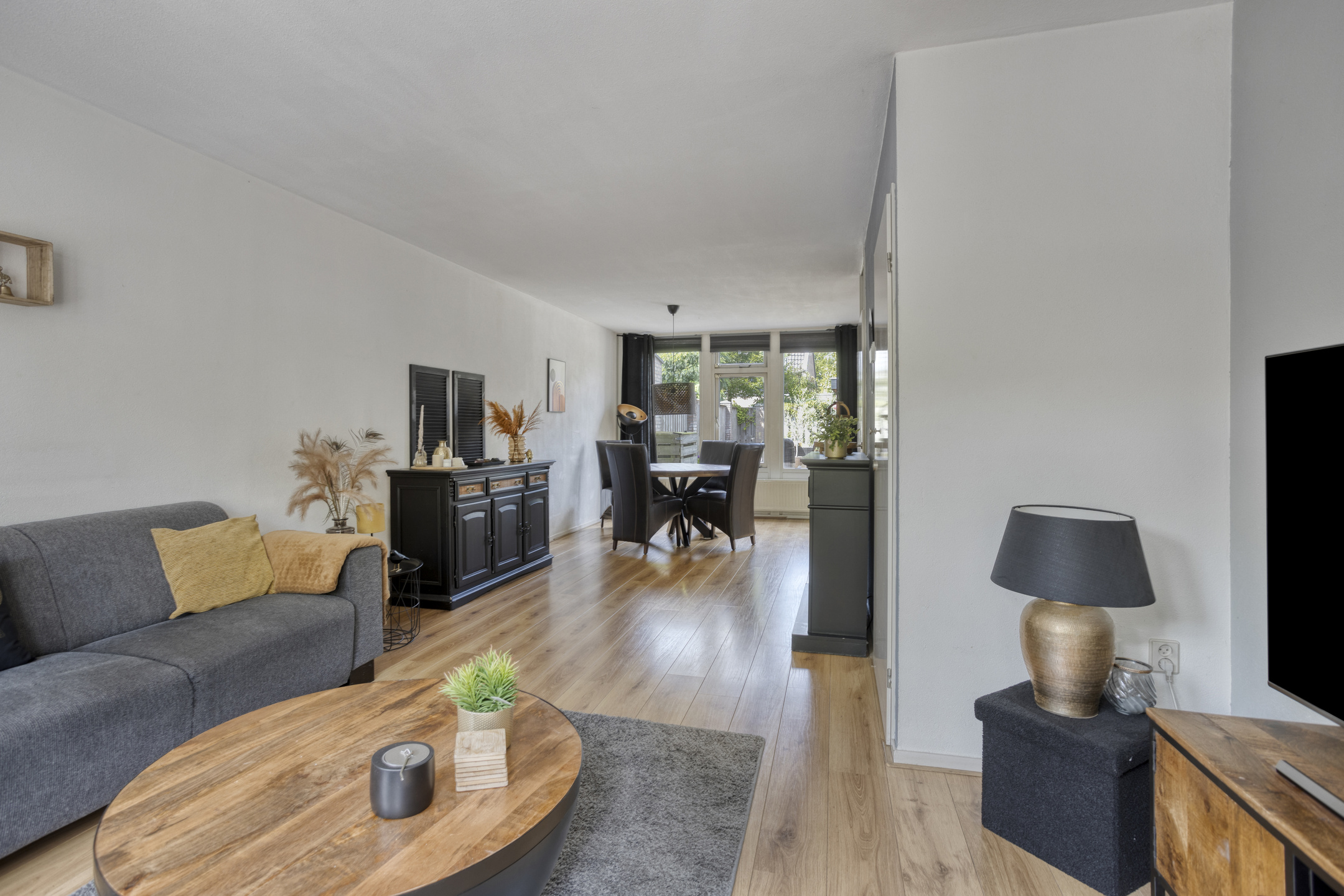 The well-kept living room extends the full length of the house and features a beautiful laminate floor. At the front, there is a cozy sitting area with large windows and a practical storage cupboard beneath the stairs.